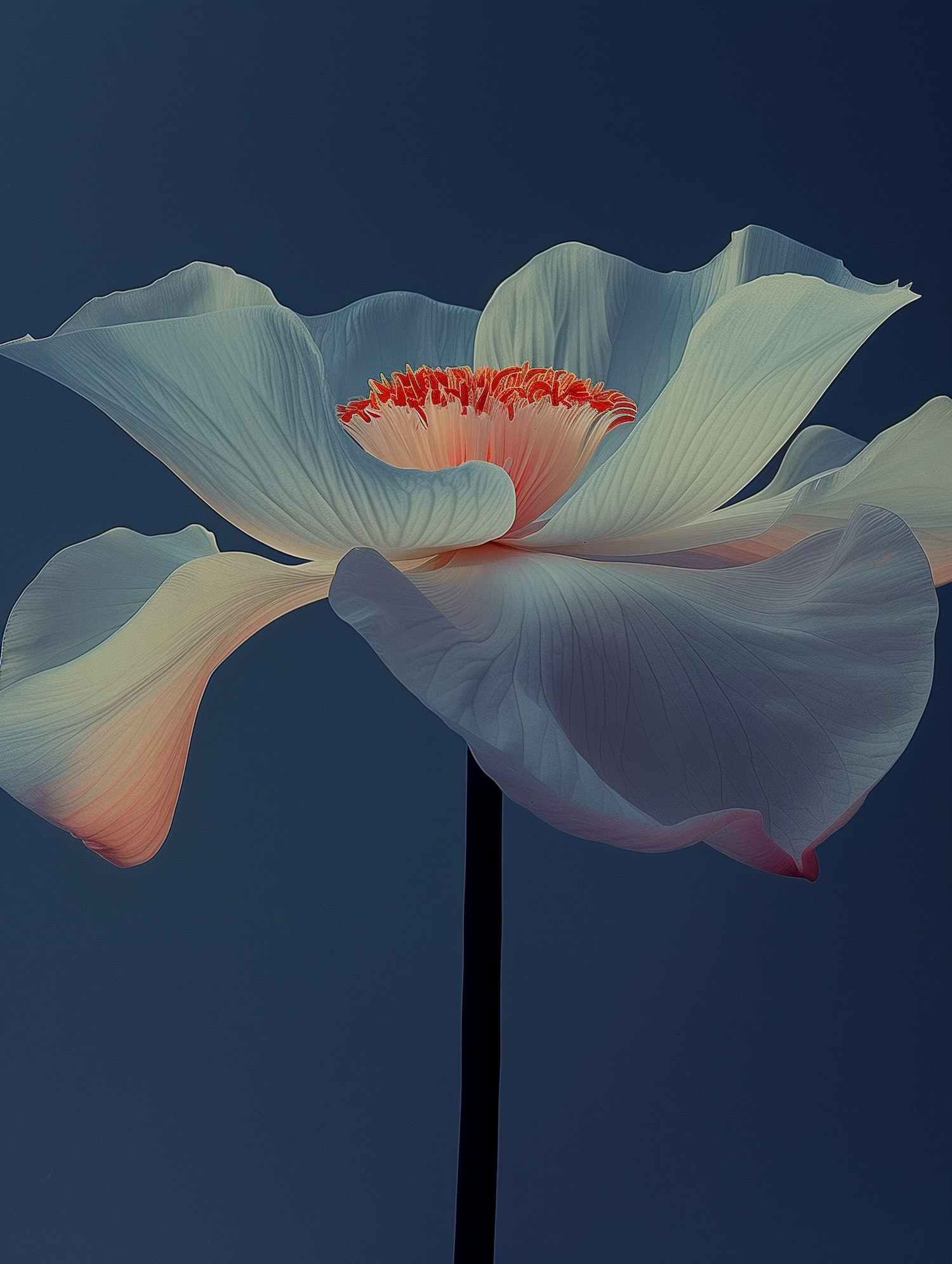 Elegant flower with creamy white petals and vibrant orange stamens against a deep blue background, showcasing delicate beauty.