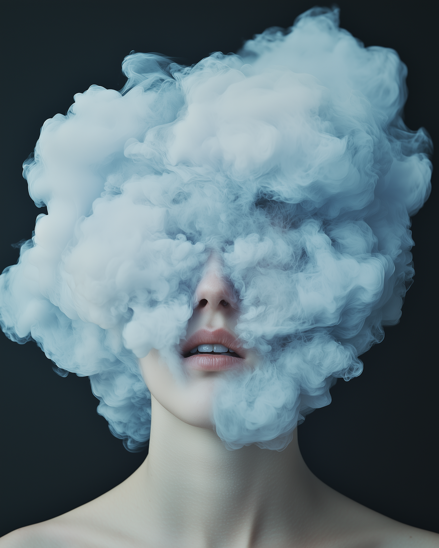 A surreal portrait of a person with pale skin, their face obscured by swirling white smoke, creating a mysterious and dreamlike vibe.