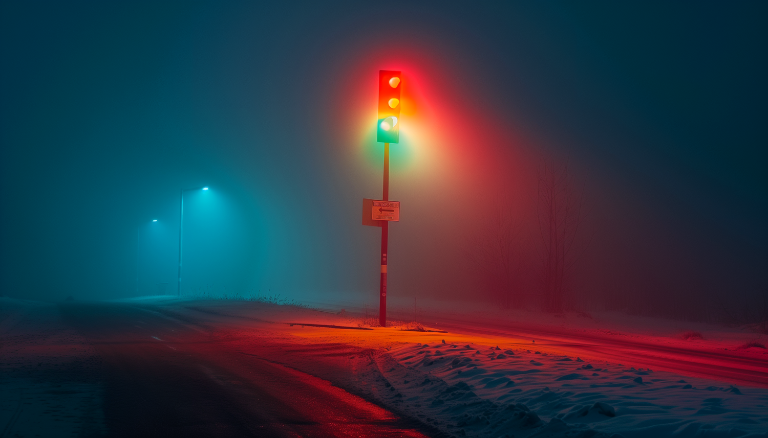 Eerie foggy night scene with a glowing red traffic light and snow-covered road, creating a mysterious and isolated atmosphere.