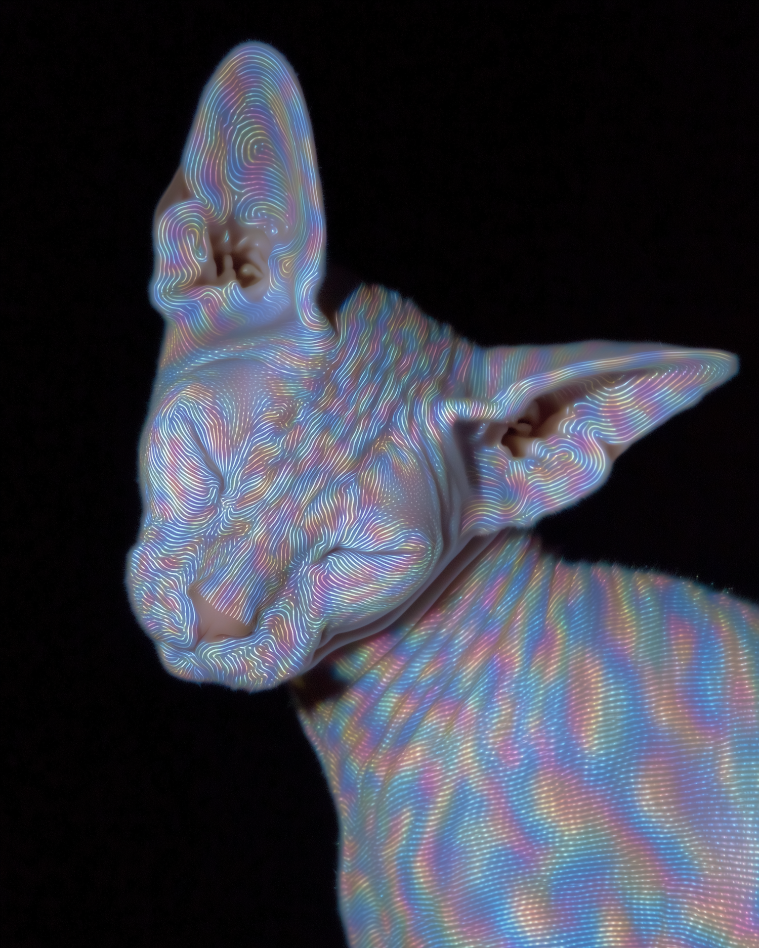 Stylized digital art showcasing a Sphynx cat with a vibrant, colorful contour overlay, set against a black backdrop.