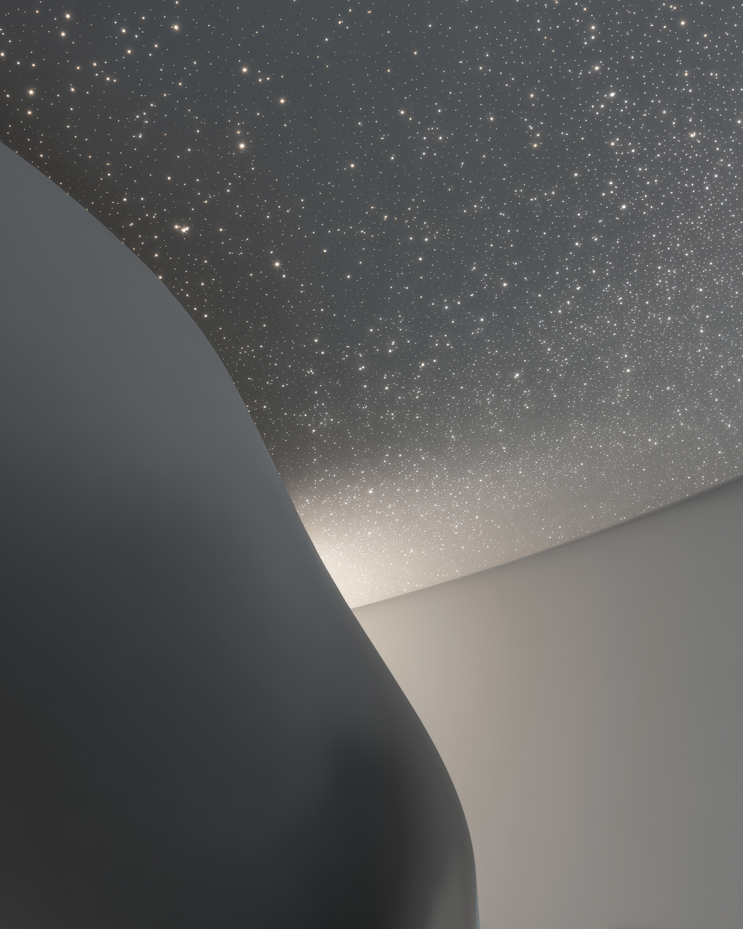 A stunning abstract scene blending a starry sky with smooth, curved surfaces and soft lighting for a surreal, minimalist aesthetic.