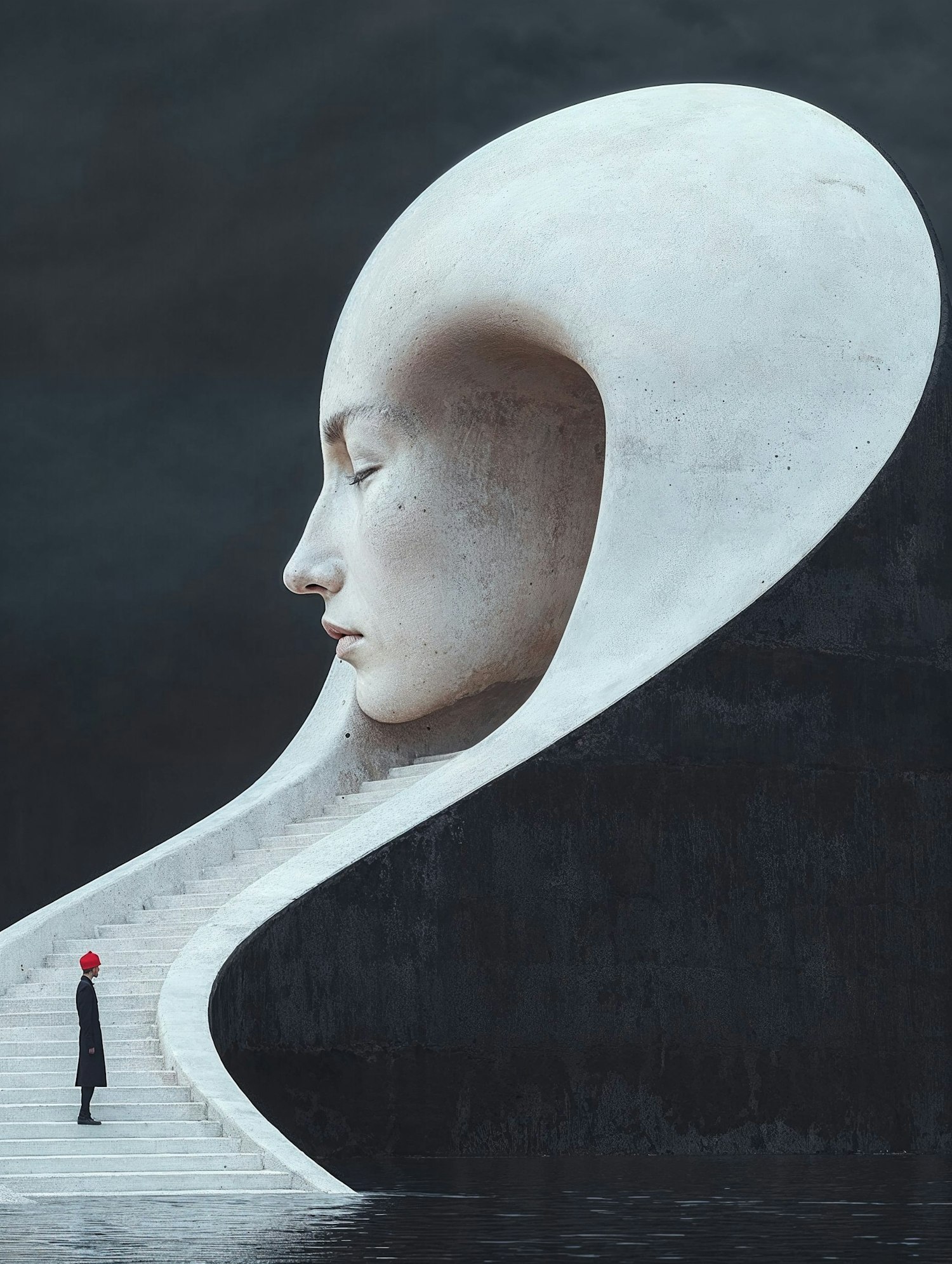 Surreal scene with a giant stone face sculpture and a lone figure in a red hat on a winding staircase, set against a dark sky.