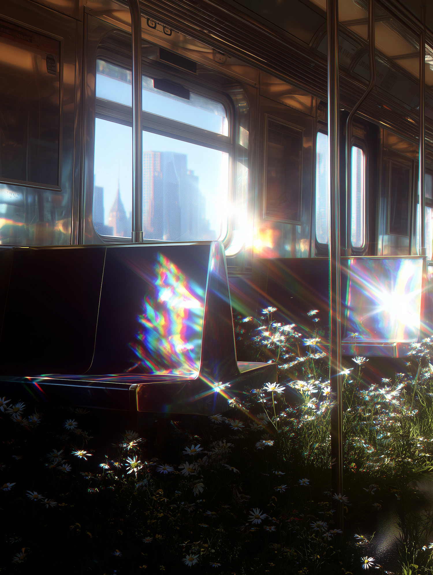 A subway car filled with daisies and sunlight, blending urban and natural elements with a dreamy prism light effect.