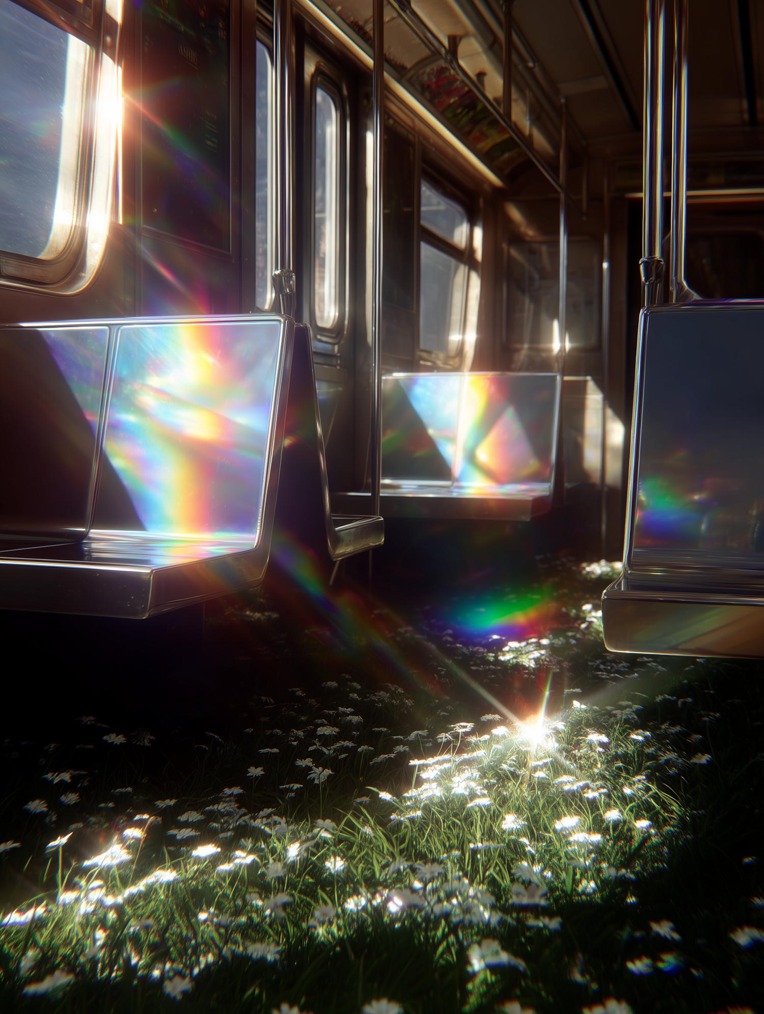 A subway car filled with sunlight, rainbow reflections, and a floor covered in blooming daisies, creating a surreal and dreamy atmosphere.