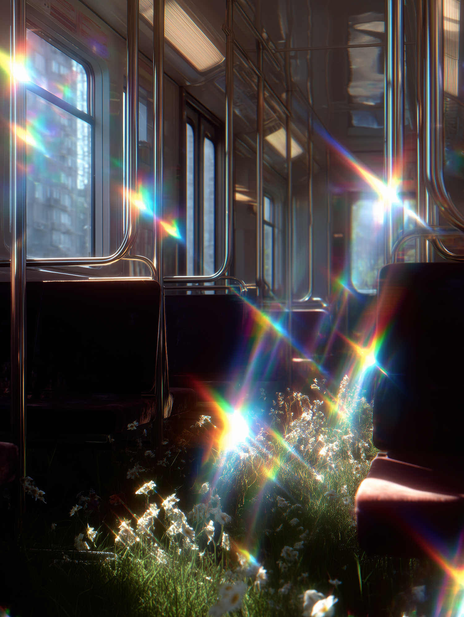 A surreal subway car with grass and flowers growing inside, illuminated by rainbow light flares and soft natural light.