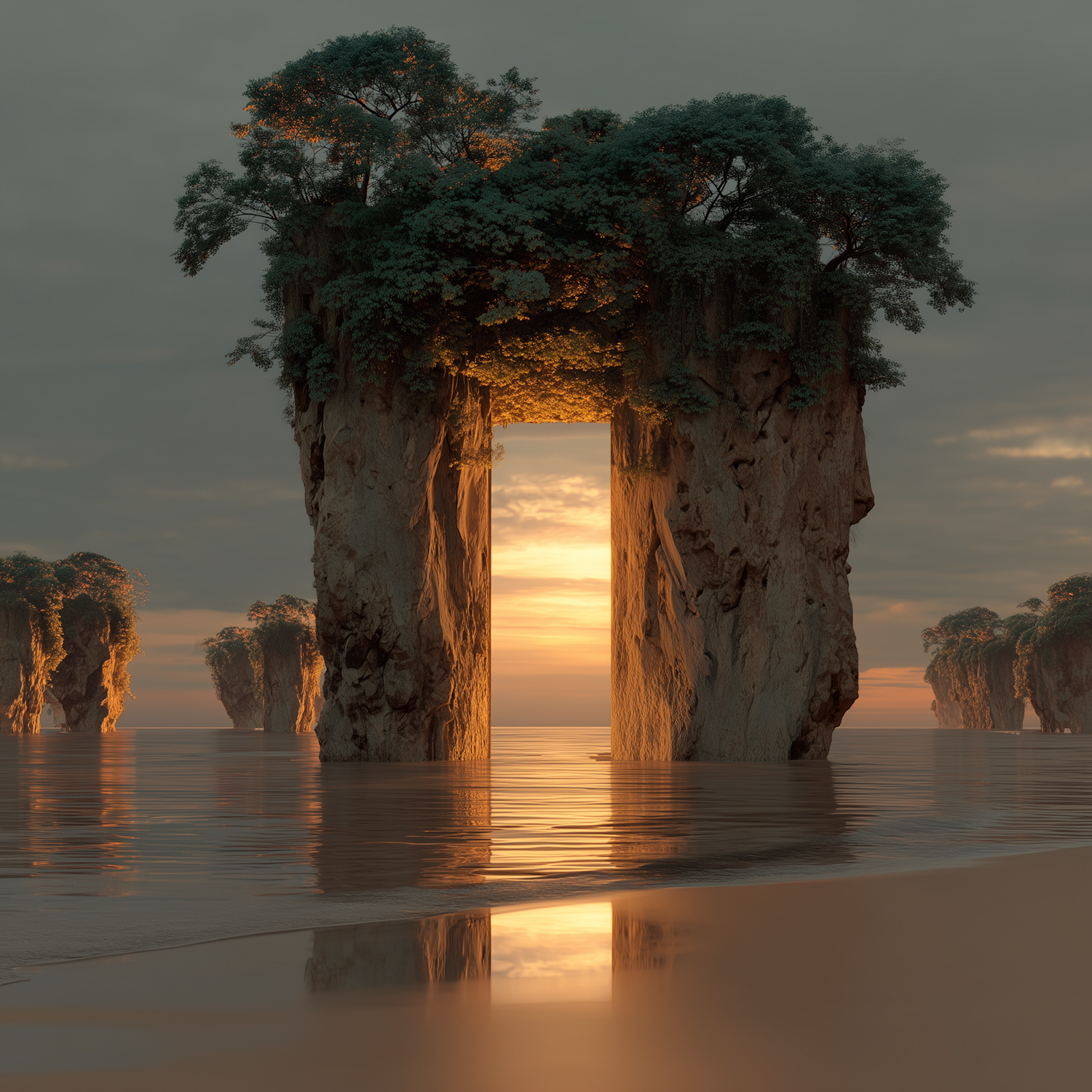 Surreal rock formations with lush trees rise from calm waters, framing a glowing sunset in a tranquil, dreamlike landscape.