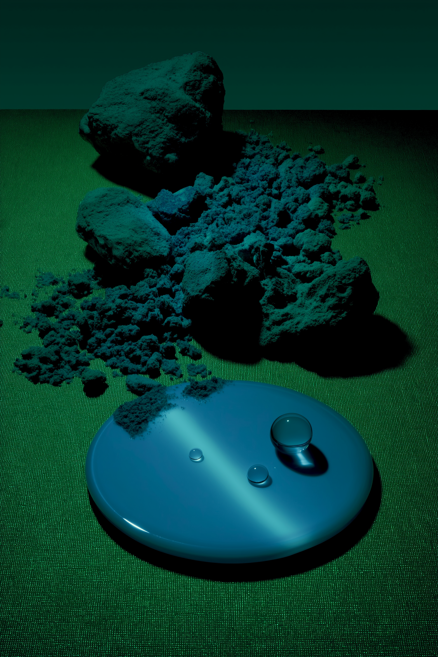 A surreal scene with rocks, soil, and reflective water droplets on a smooth blue surface, set against a textured green background.
