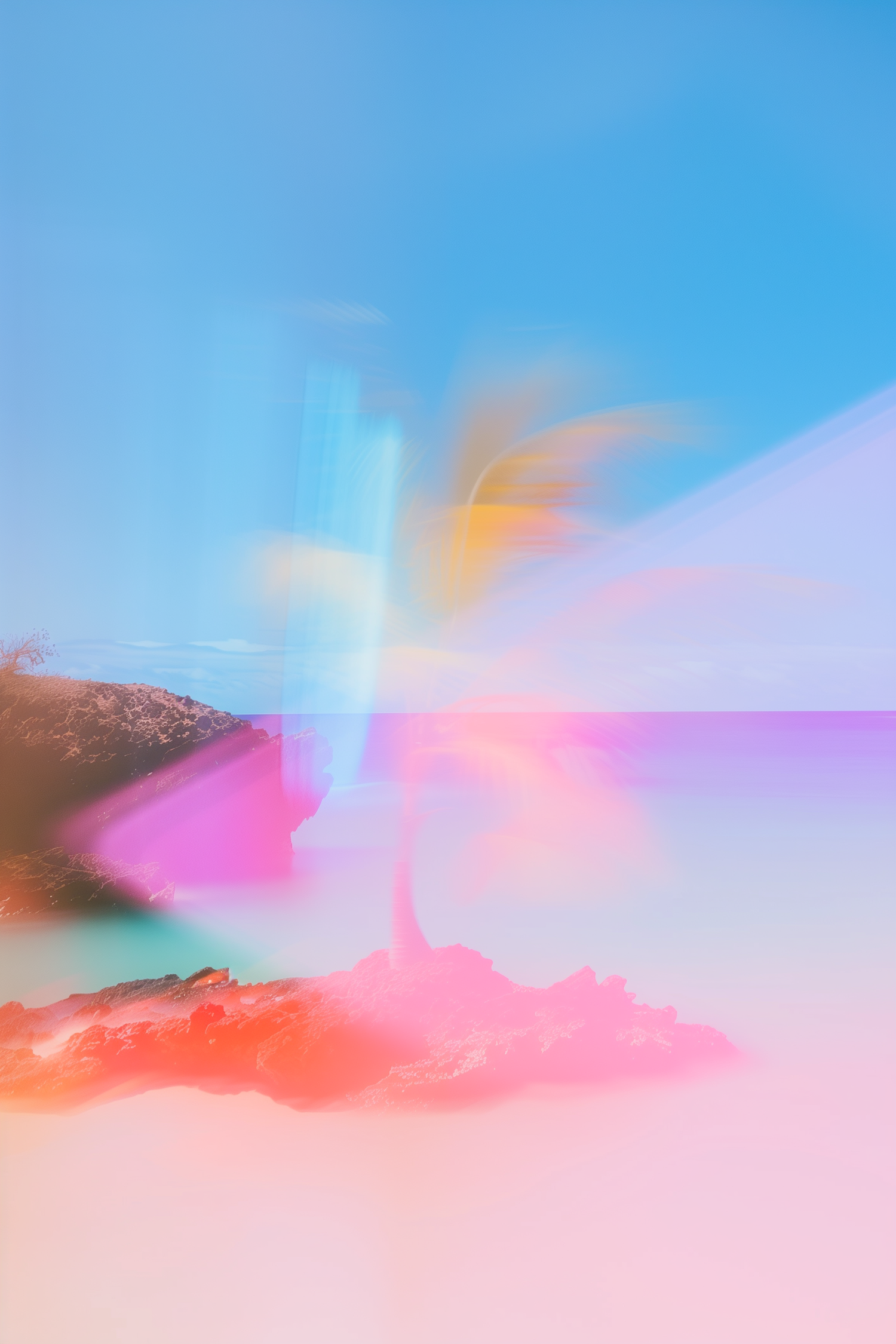 Dreamy tropical beach scene with pastel hues, a blurred palm tree, and vibrant pink, orange, and blue tones for a surreal vibe.