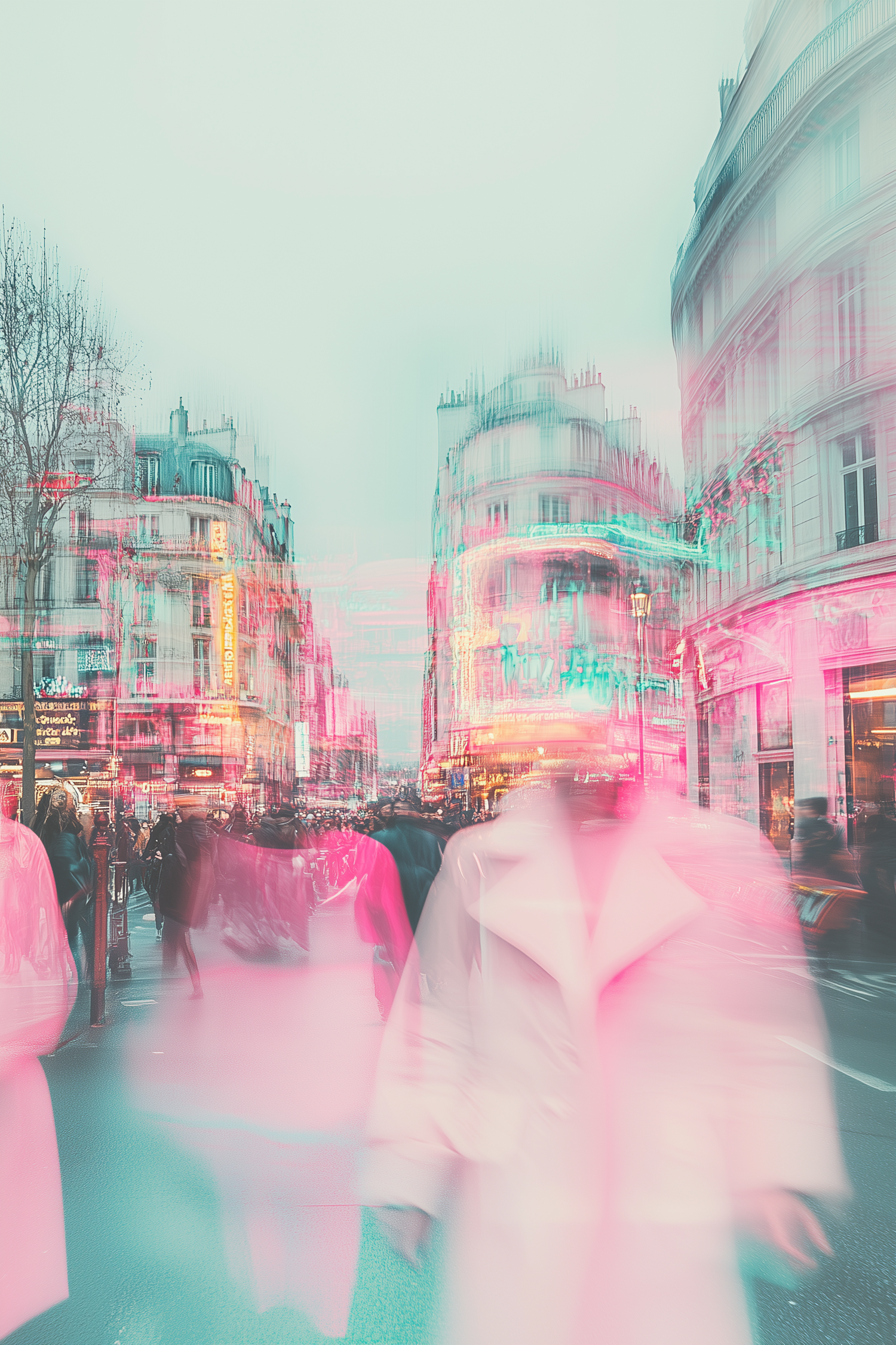 Dreamy urban street scene with neon lights, blurred figures, and pastel tones, creating a surreal and futuristic atmosphere.