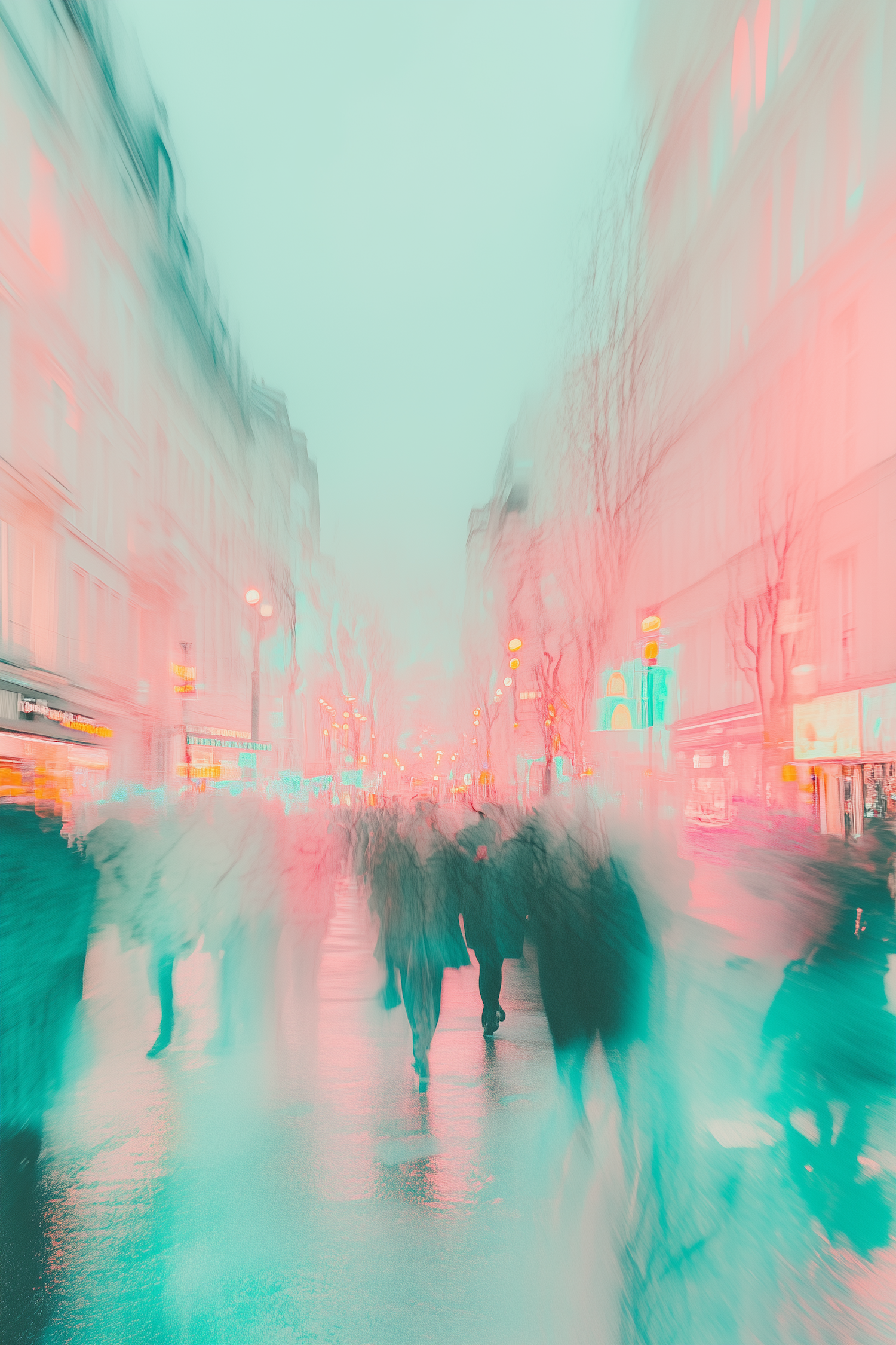 A dreamy, pastel-toned urban street scene with blurred figures and glowing lights, creating a surreal and abstract atmosphere.
