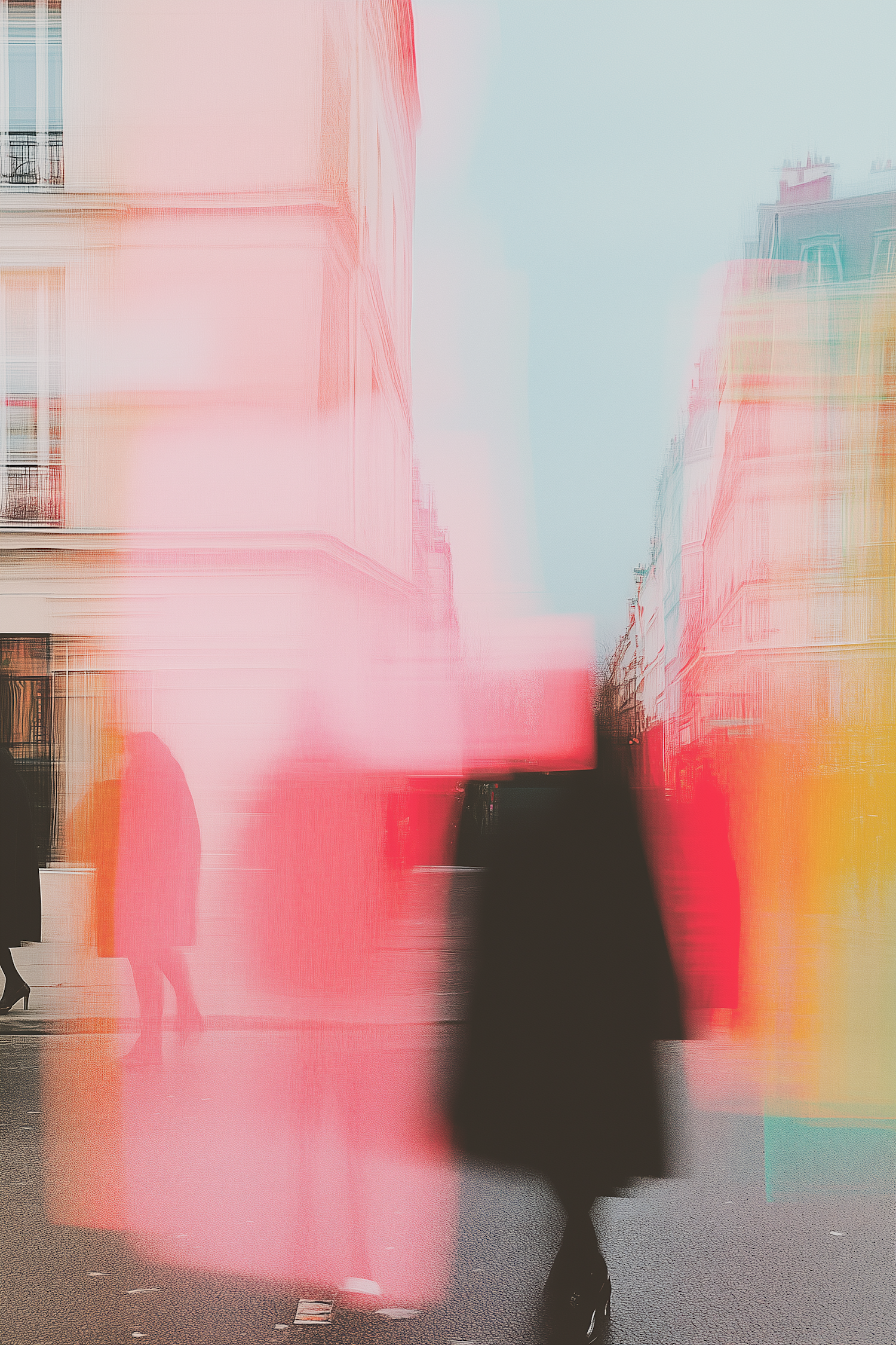 A dreamy urban street scene with blurred silhouettes and vibrant pink, red, and yellow overlays, creating a surreal and dynamic atmosphere.