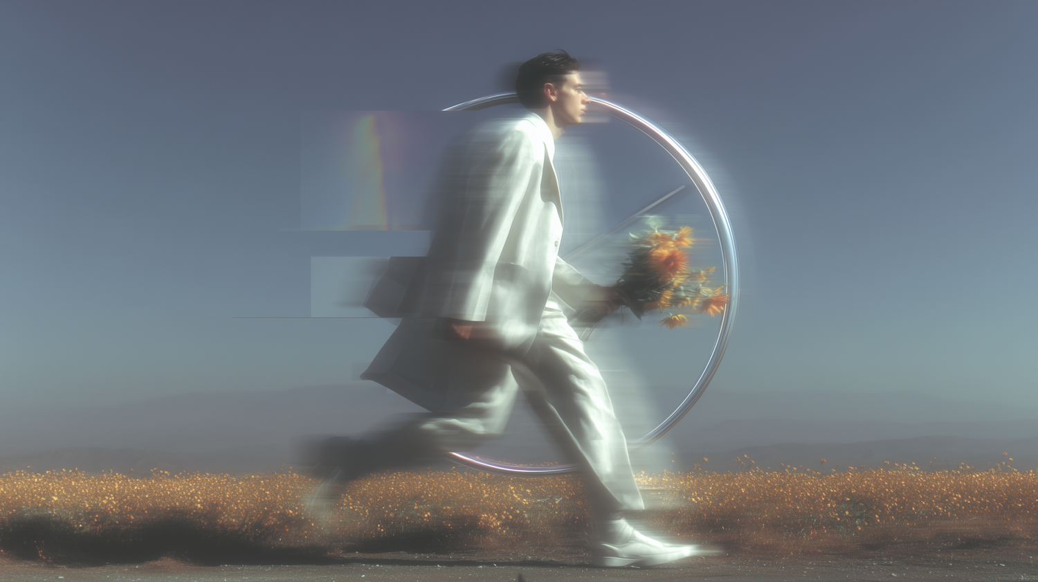 A surreal image of a person in motion, holding flowers in a field with a futuristic circular structure in the background.