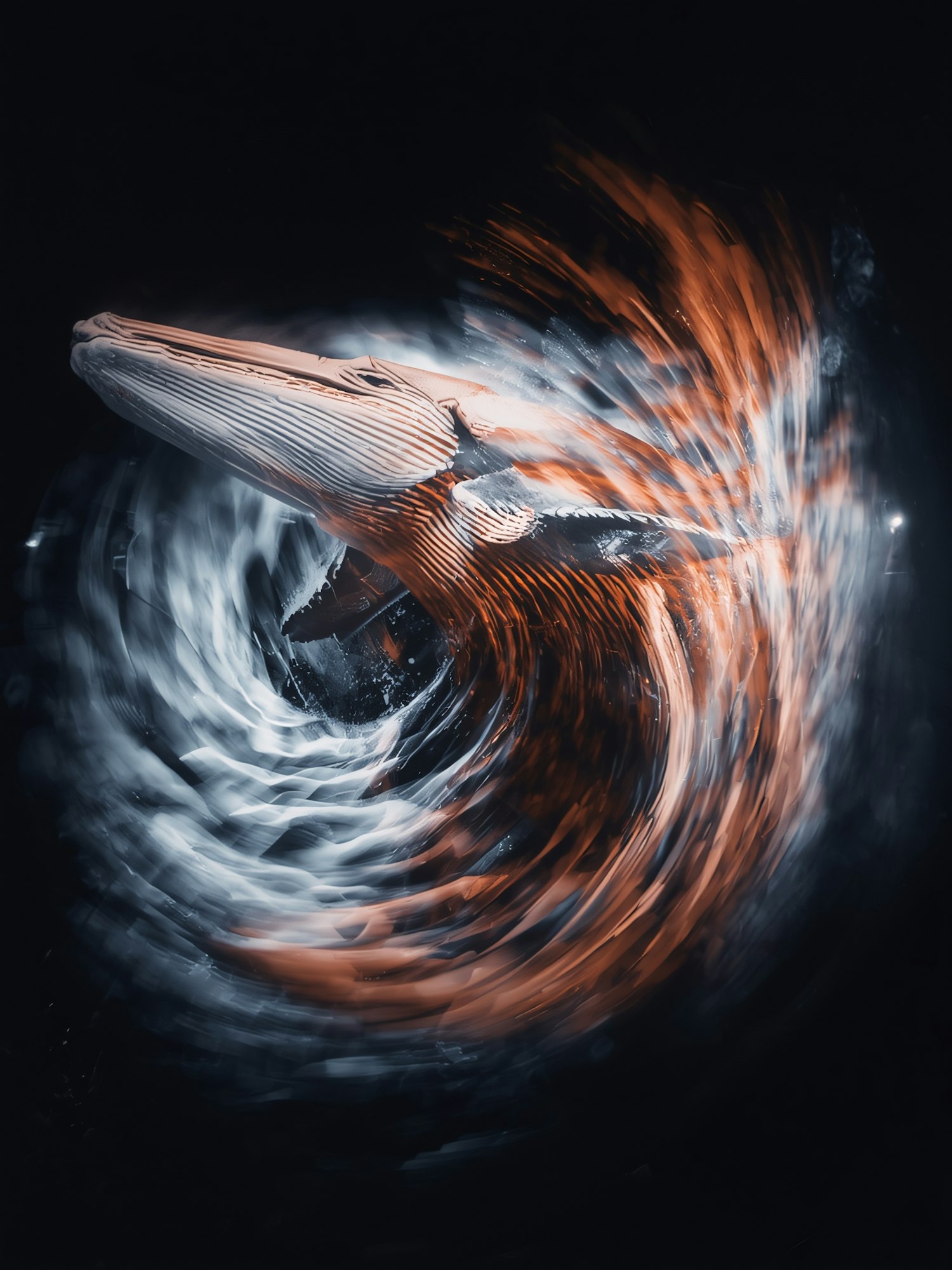 A surreal image of a whale surrounded by dynamic light swirls in contrasting white and orange hues, set against a dark background.