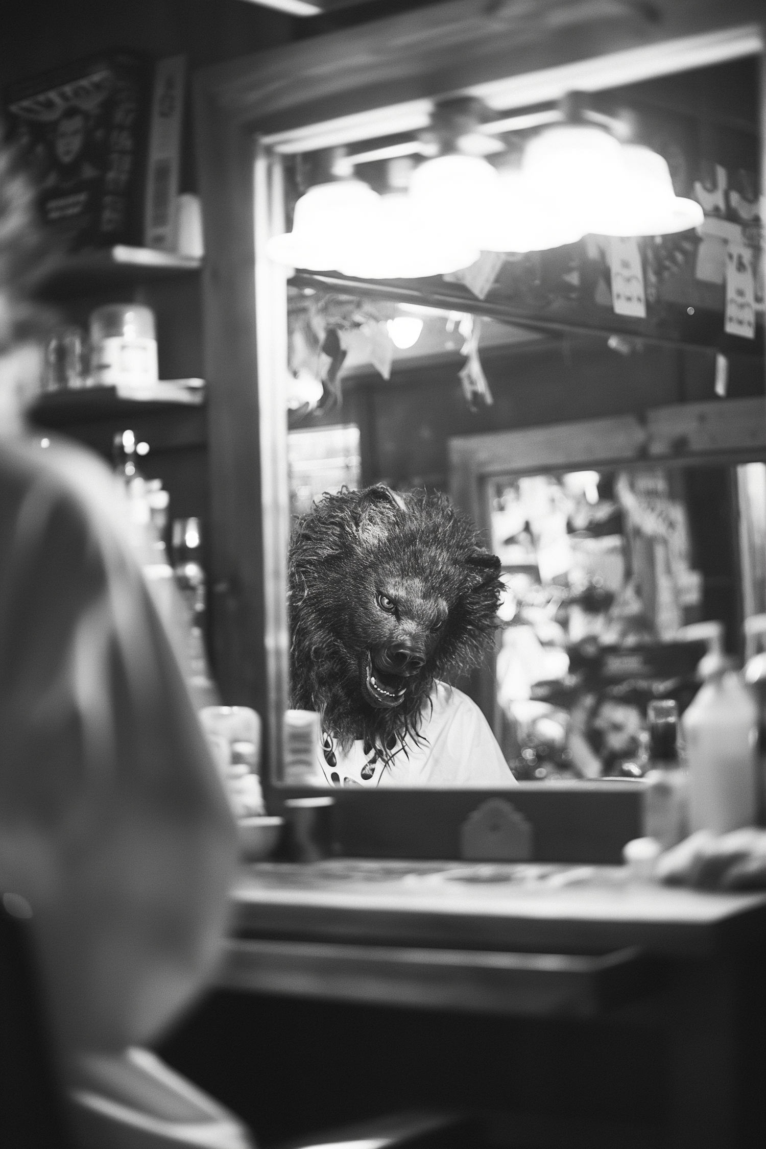 A person in a werewolf mask sits in a barbershop, captured in a striking black and white photo.
