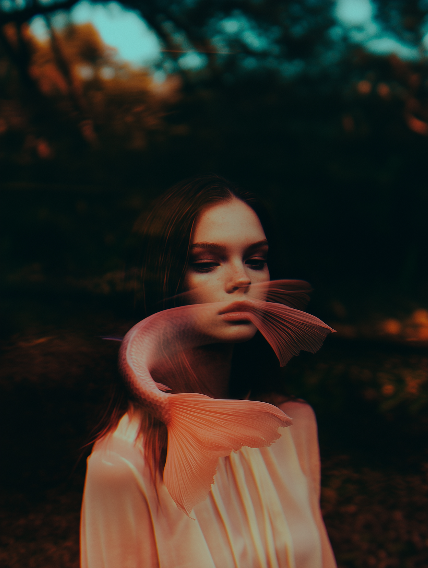 A surreal portrait of a woman with a translucent fish swimming in front of her face, set against a dreamy forest backdrop.
