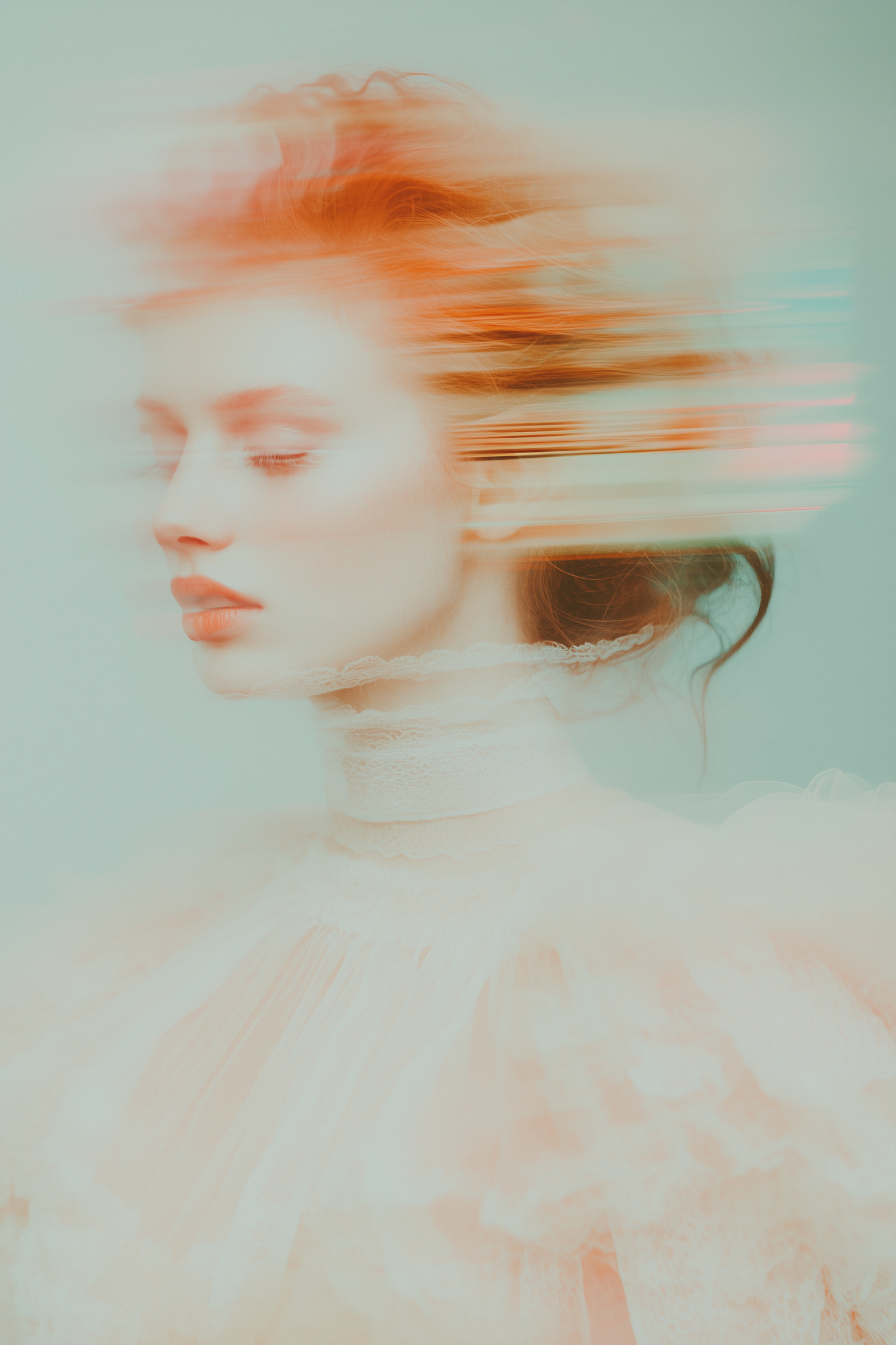 Dreamy portrait of a red-haired woman in lace, with blurred light streaks and a soft mint green background for an ethereal vibe.