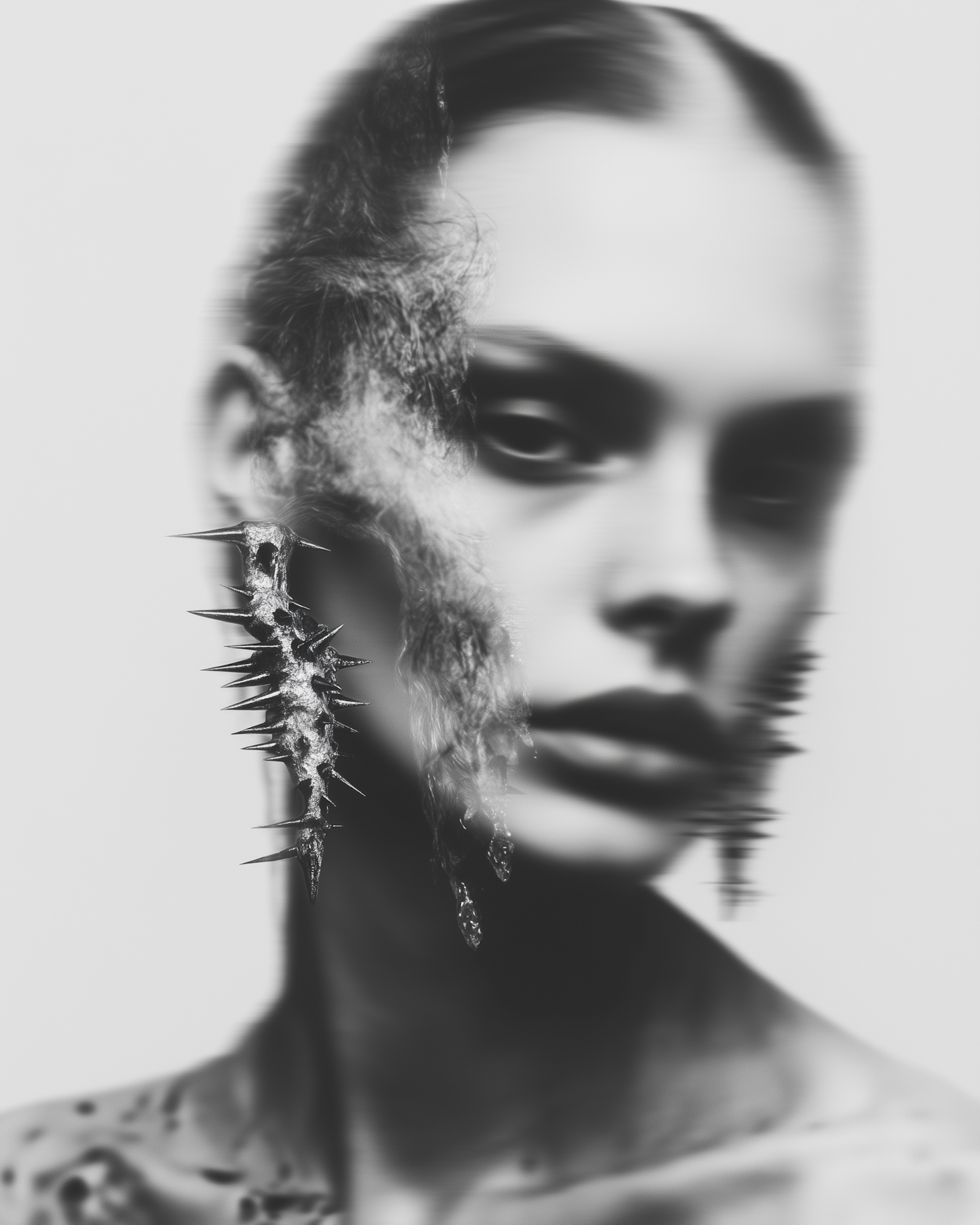 Surreal black-and-white portrait of a woman with a spiked earring and distorted facial textures, creating an abstract, dreamlike effect.