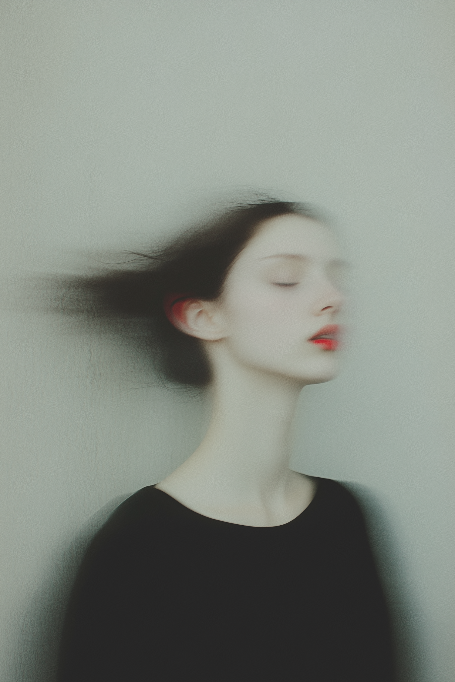A dreamy portrait of a woman with blurred motion in her hair, red lips, and a minimalist background. Perfect for artistic inspiration.