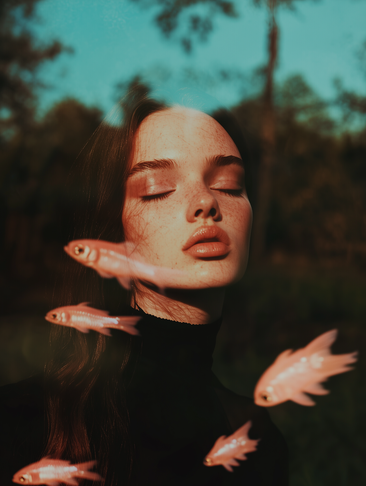 Dreamy portrait of a freckled woman with pink fish overlay, serene expression, and warm lighting in a surreal outdoor setting.
