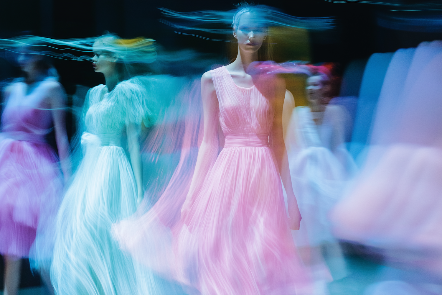 Dreamlike scene of women in pastel dresses with motion blur, creating a surreal and ethereal atmosphere.