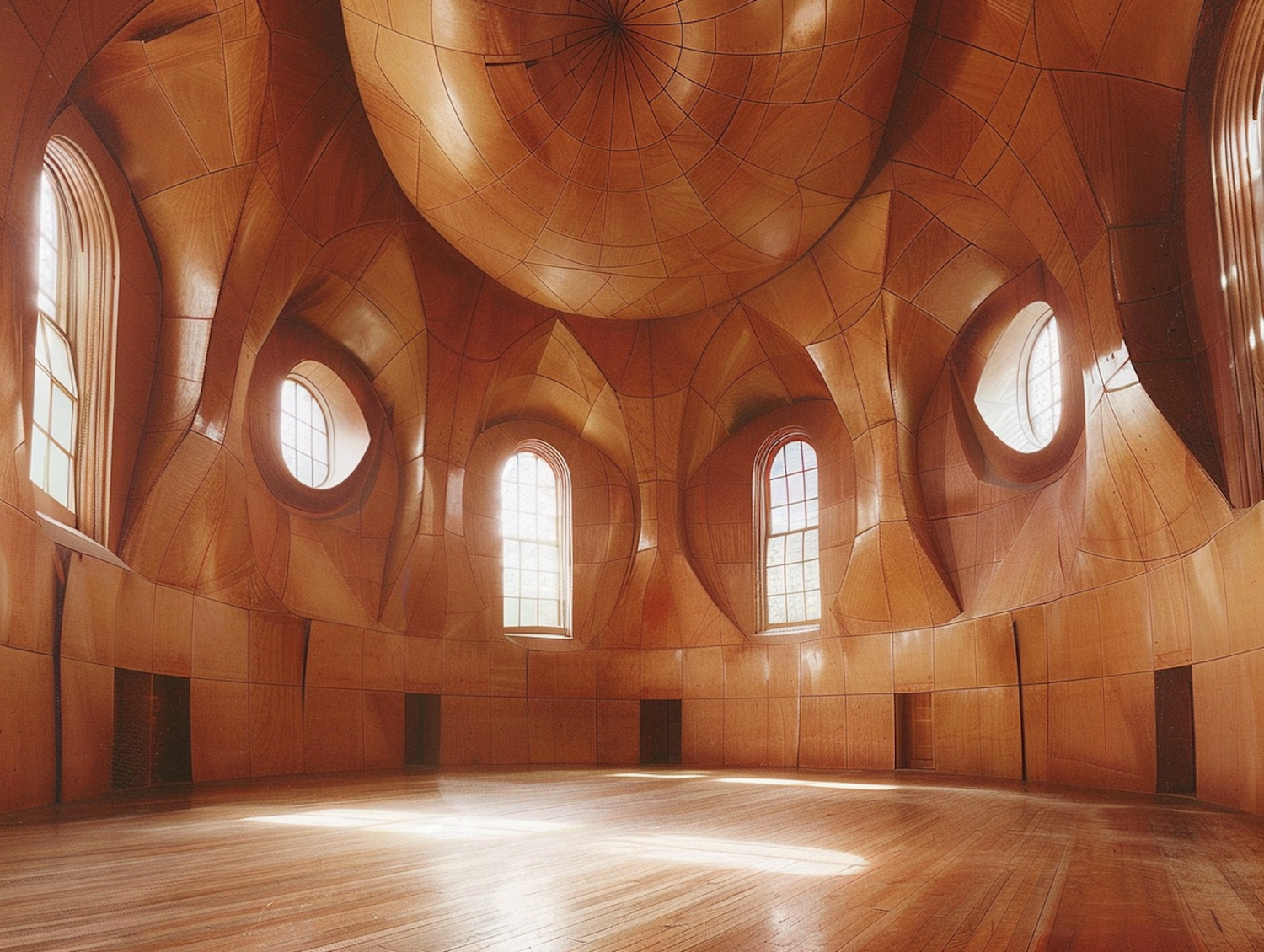Spacious room with intricate wooden architecture, featuring geometric patterns and large arched windows for natural light.