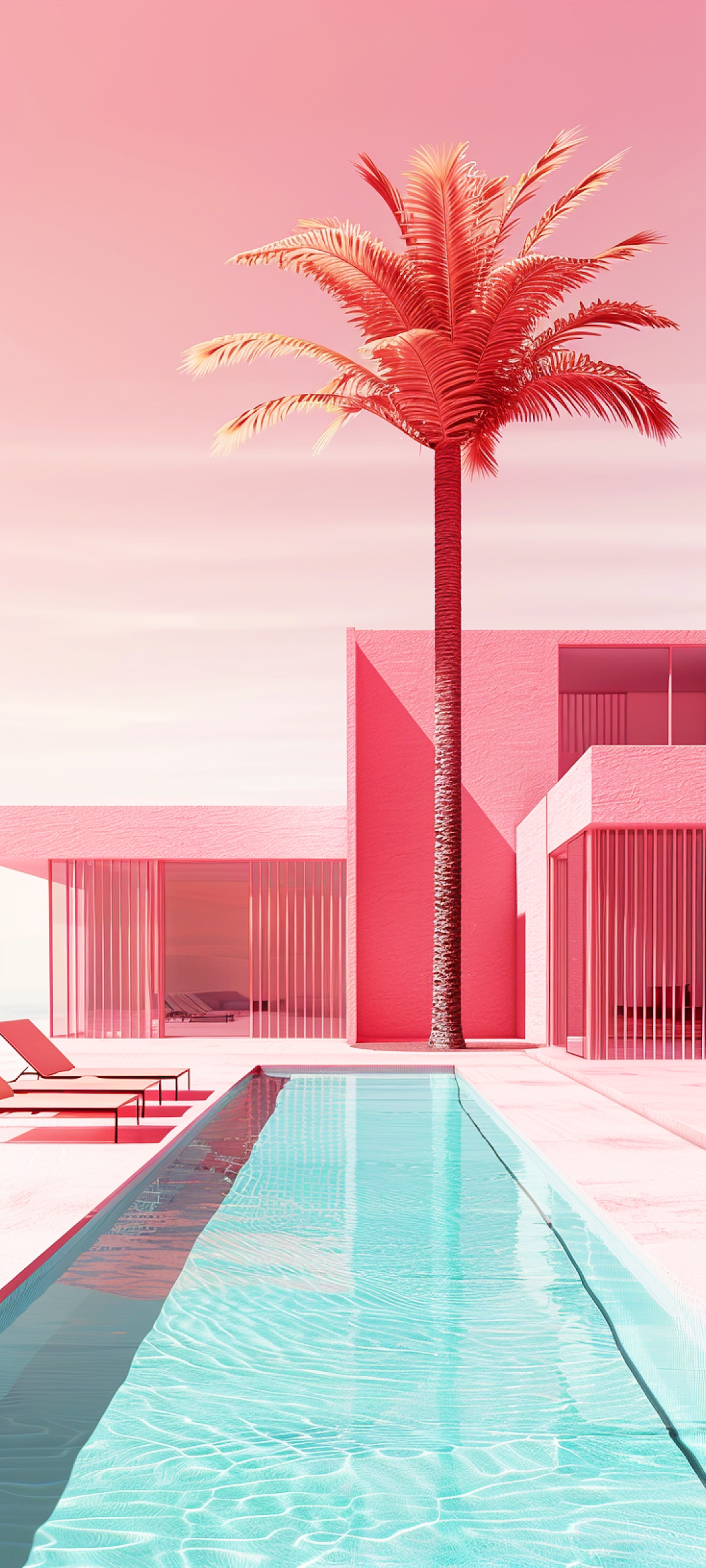 Surreal pink architectural scene with a palm tree, modern building, and turquoise pool, creating a dreamlike atmosphere.
