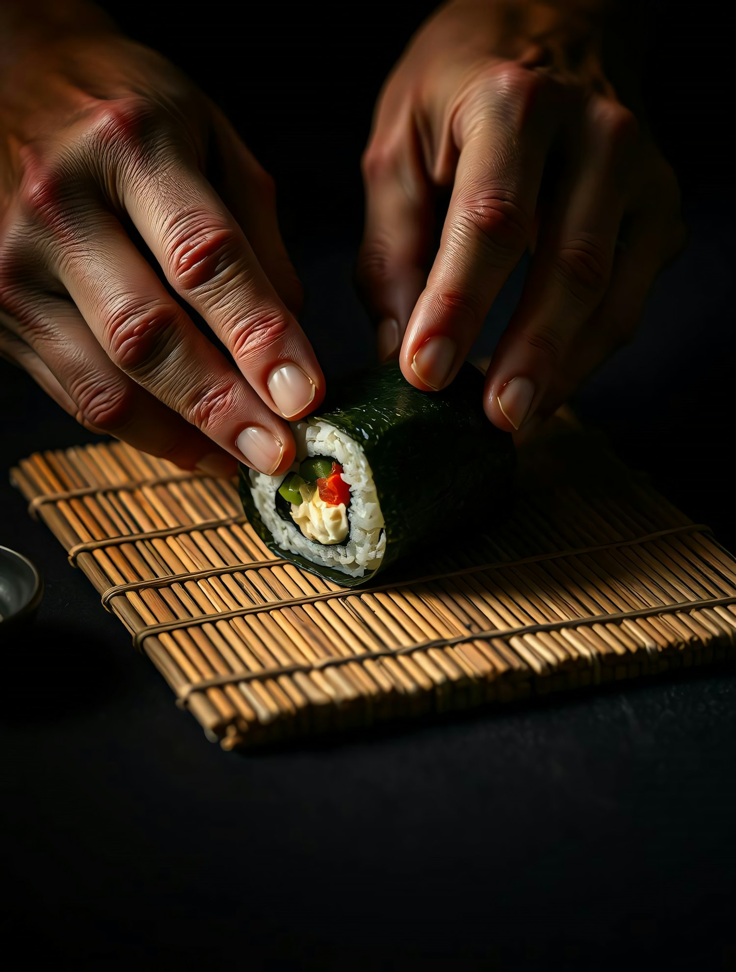 Hands rolling sushi on a bamboo mat, showcasing fresh ingredients and traditional preparation techniques.