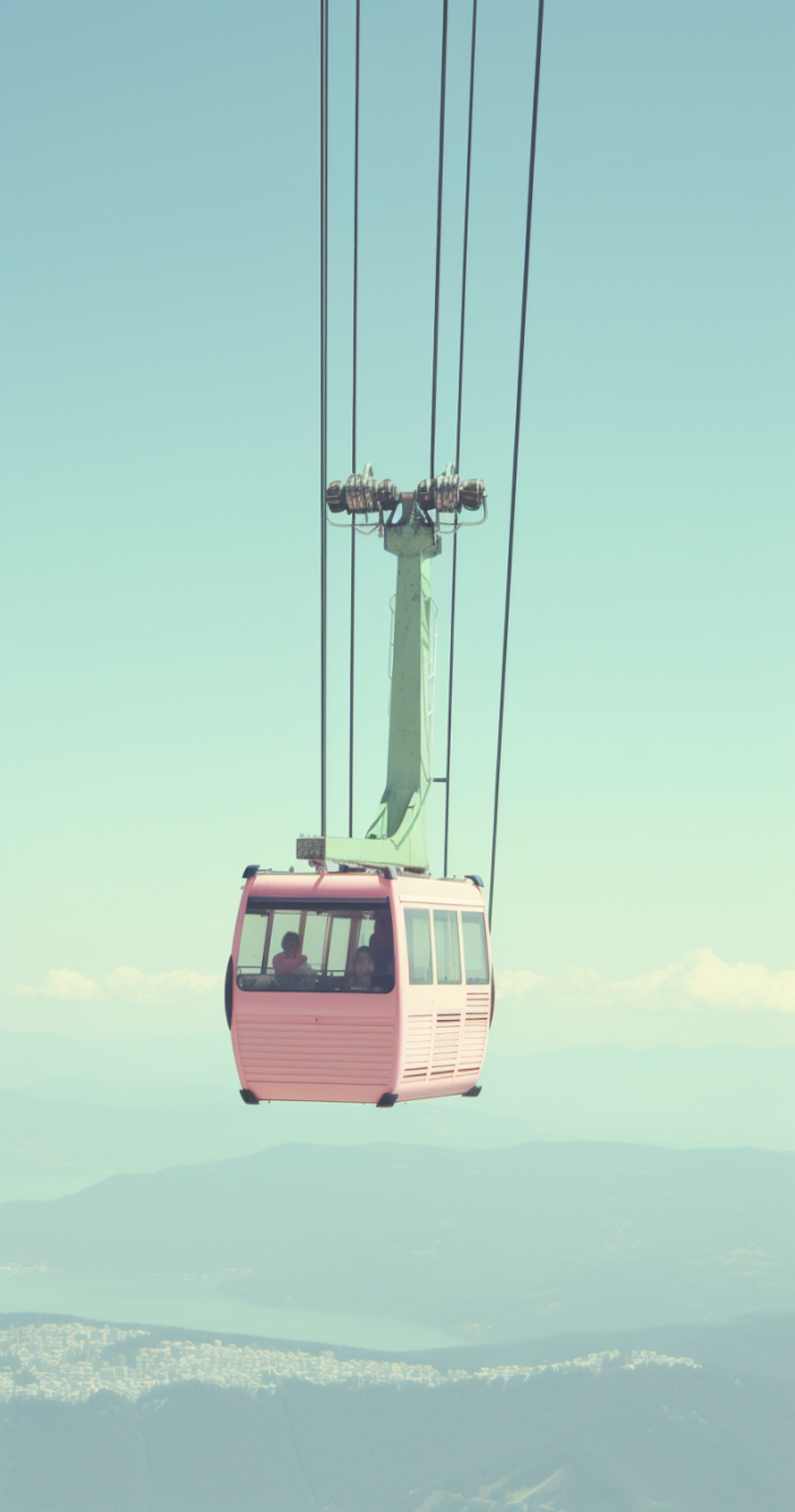 Pastel pink cable car suspended in the sky with scenic mountain and water views below, set against a clear blue sky.