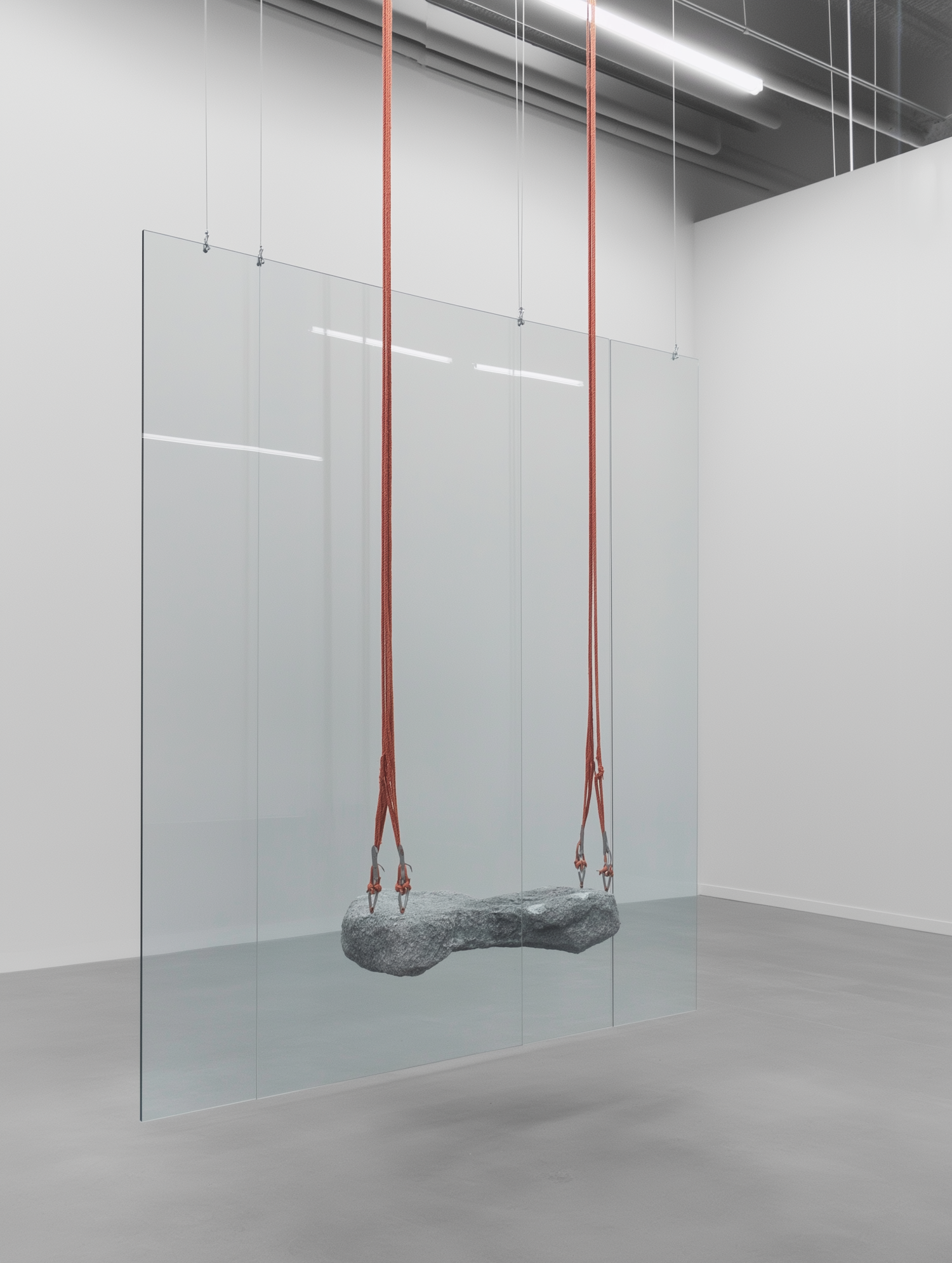 Modern art installation with a suspended stone held by red straps against a transparent glass panel in a minimalist gallery space.
