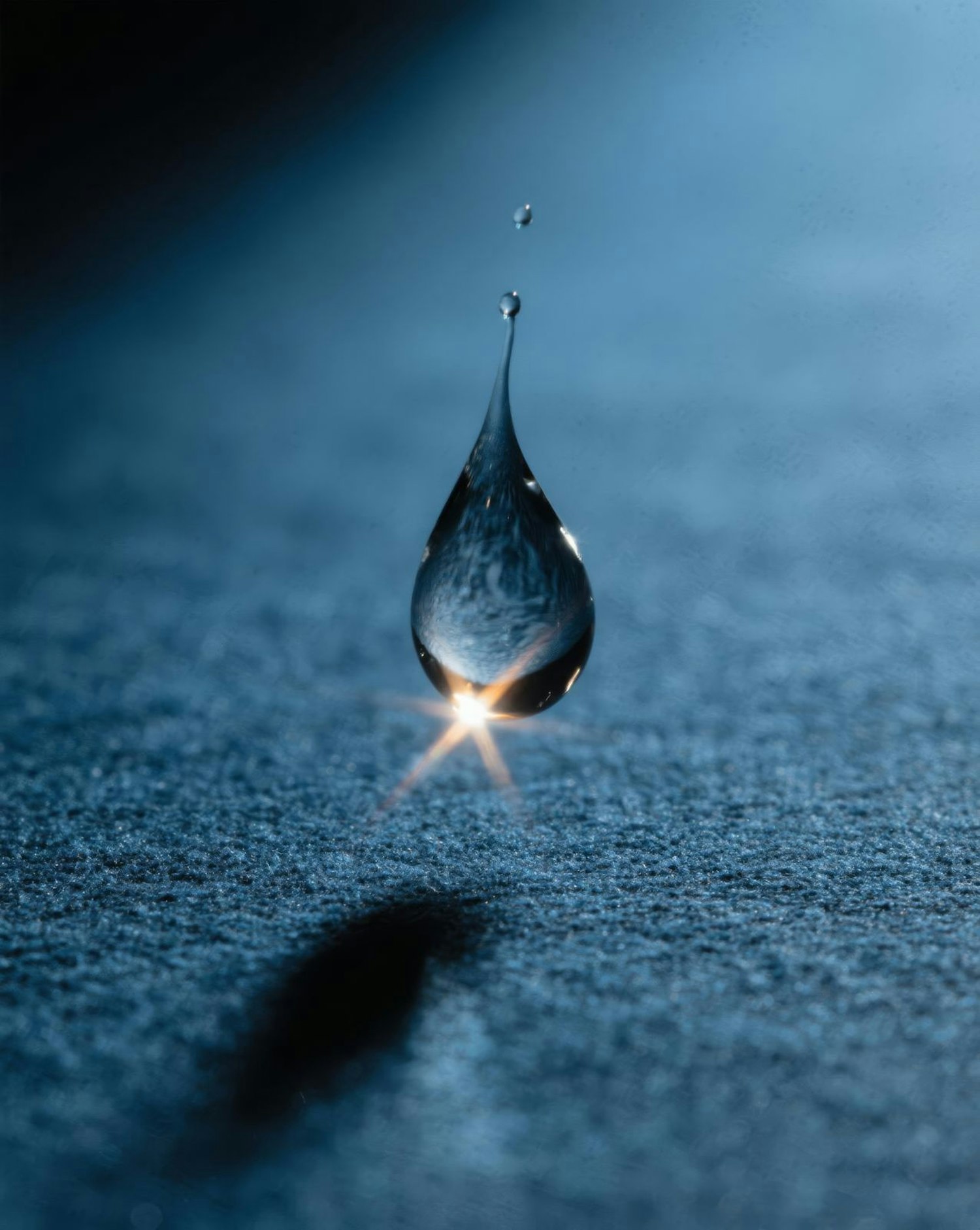 A suspended water droplet reflecting light with a starburst effect, set against a textured surface and a softly blurred background.