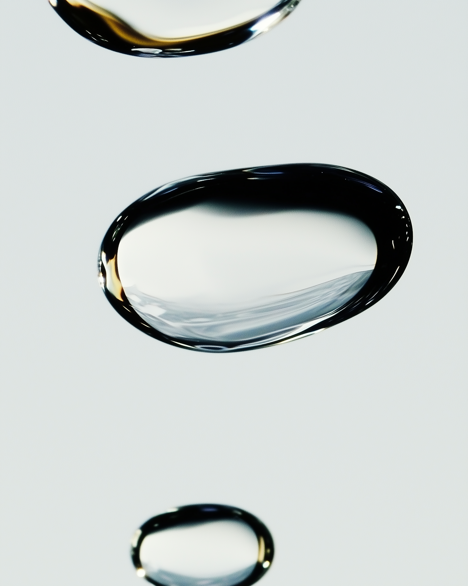 Close-up of three reflective water droplets suspended in mid-air, showcasing their glossy texture and transparency against a neutral background.