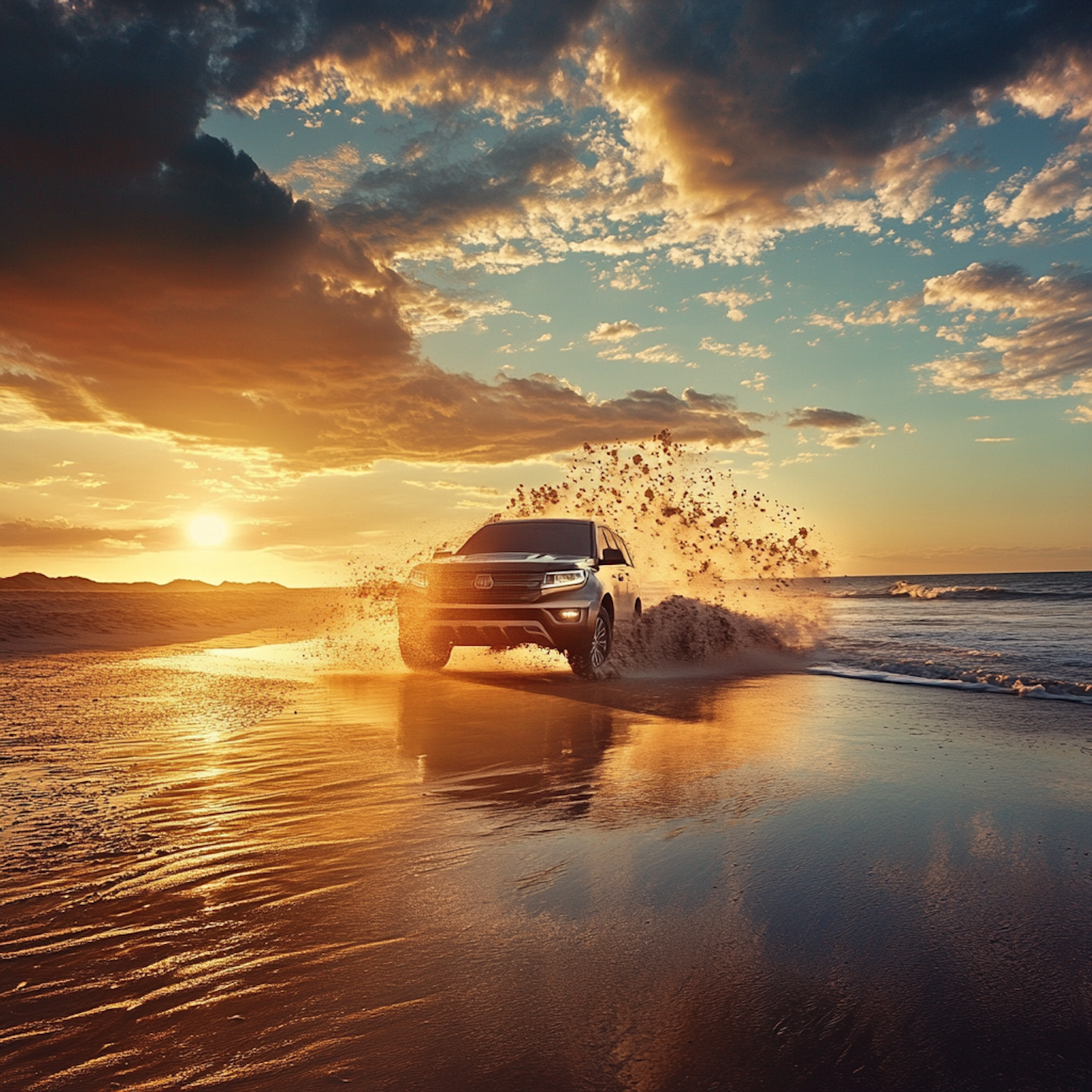SUV driving on a beach at sunset, creating a splash of sand and water under a vibrant sky.