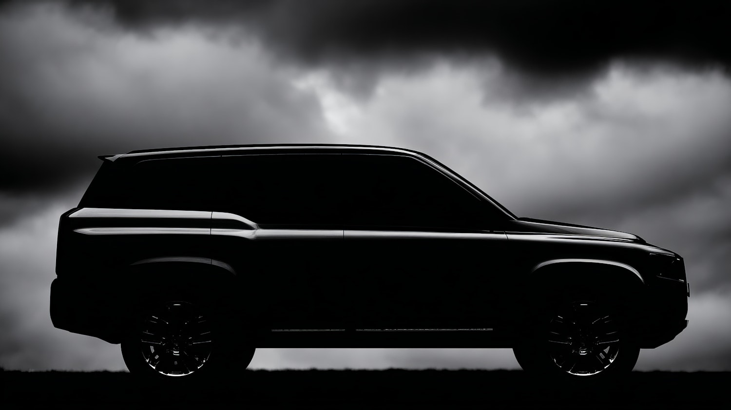 Silhouette of a modern SUV against a dramatic cloudy sky, showcasing its sleek design and robust build in a striking contrast.