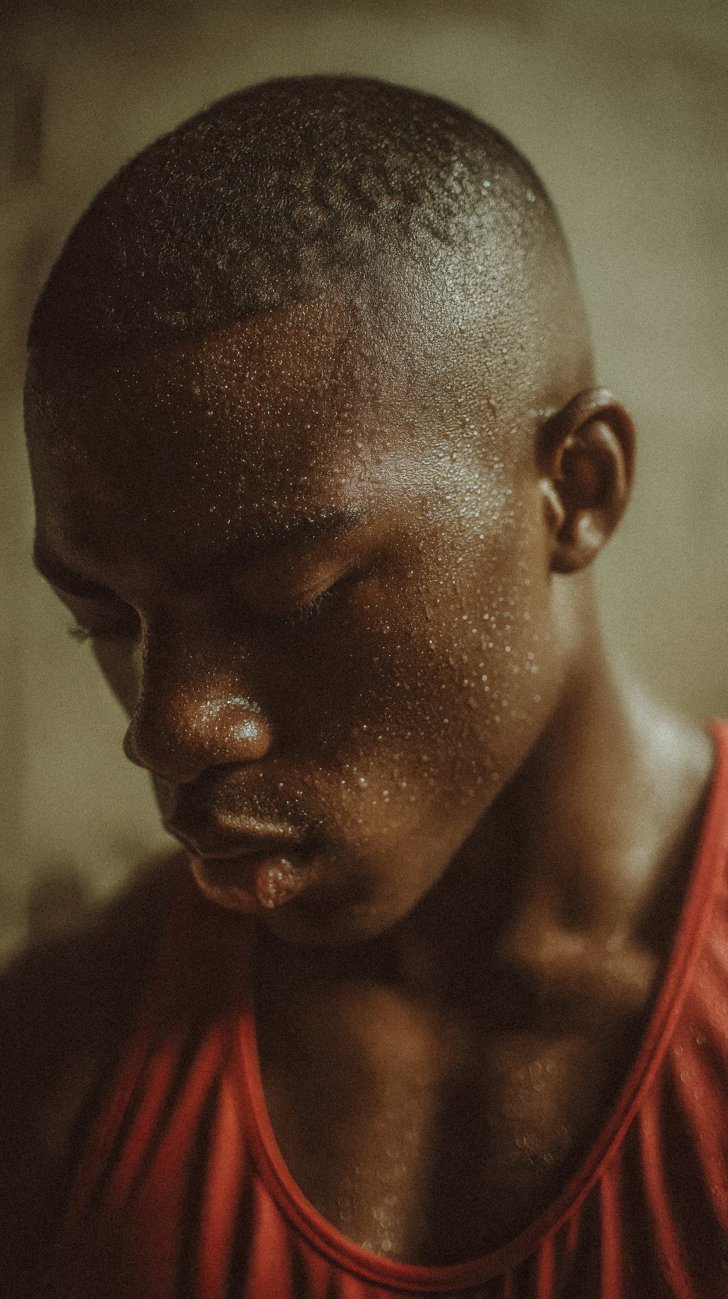 Close-up of a person in a red tank top, sweating after exertion, with soft lighting emphasizing their features and expression.