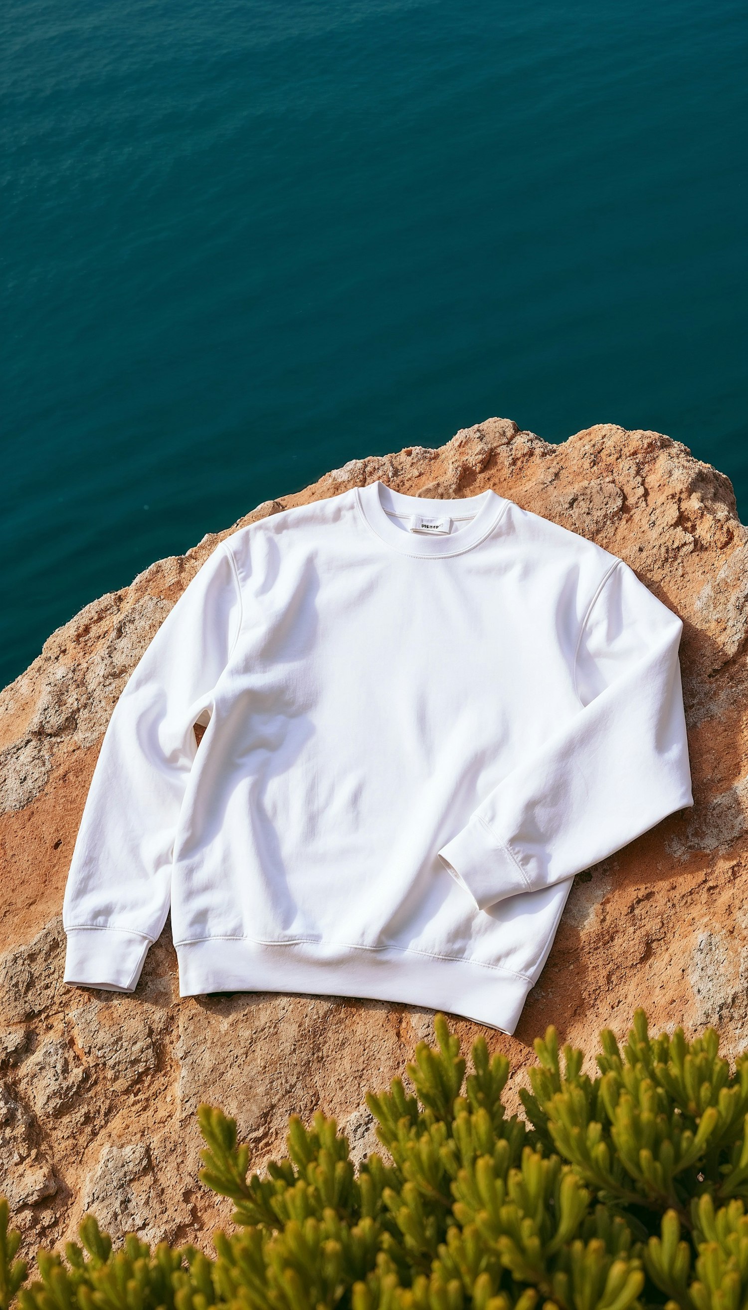 White sweatshirt on a sunlit rock with a deep blue sea in the background, accented by green foliage.