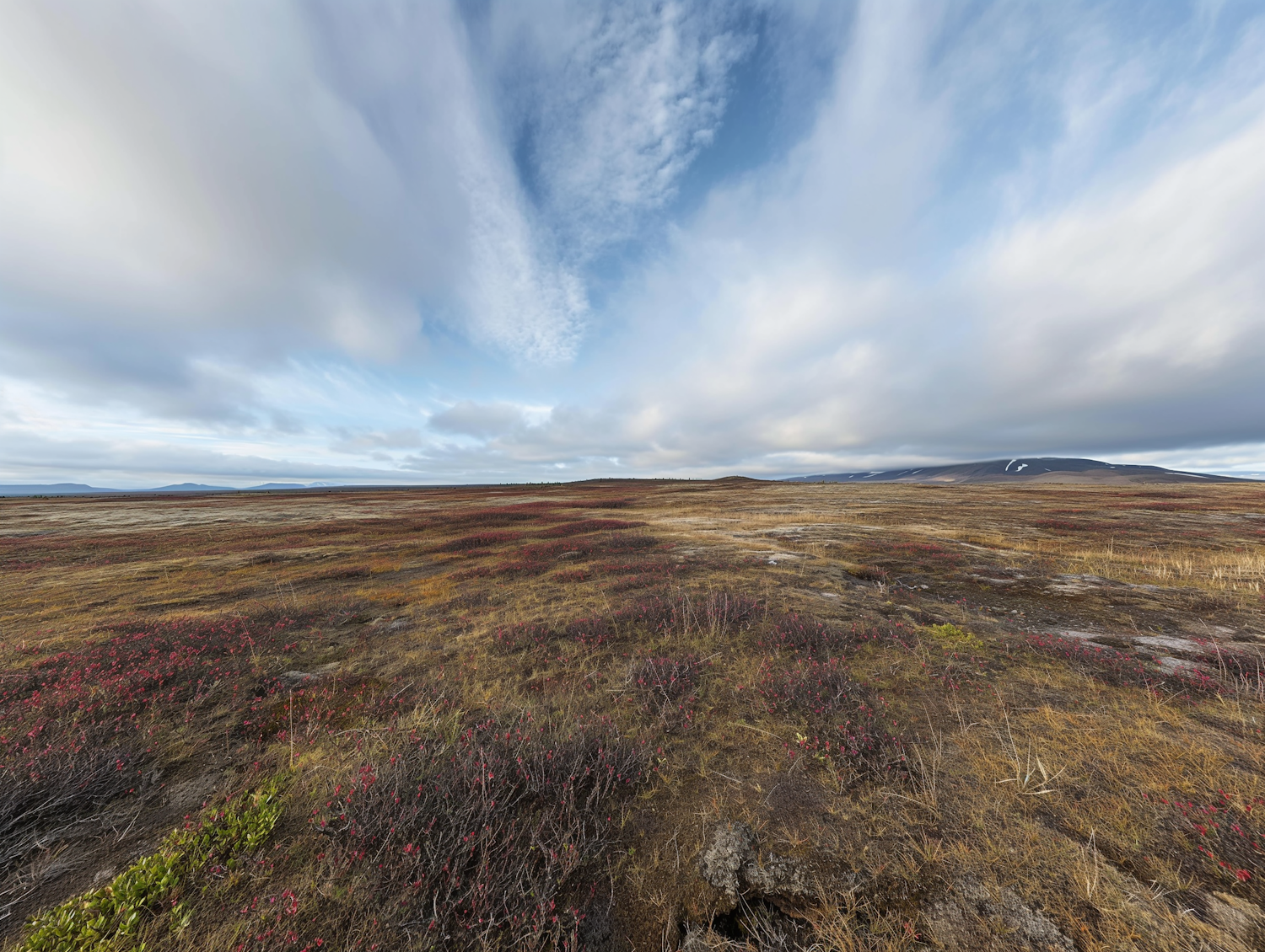 Expansive tundra landscape with autumn colors, distant snowy hills, and a dynamic cloudy sky, evoking serenity and isolation.