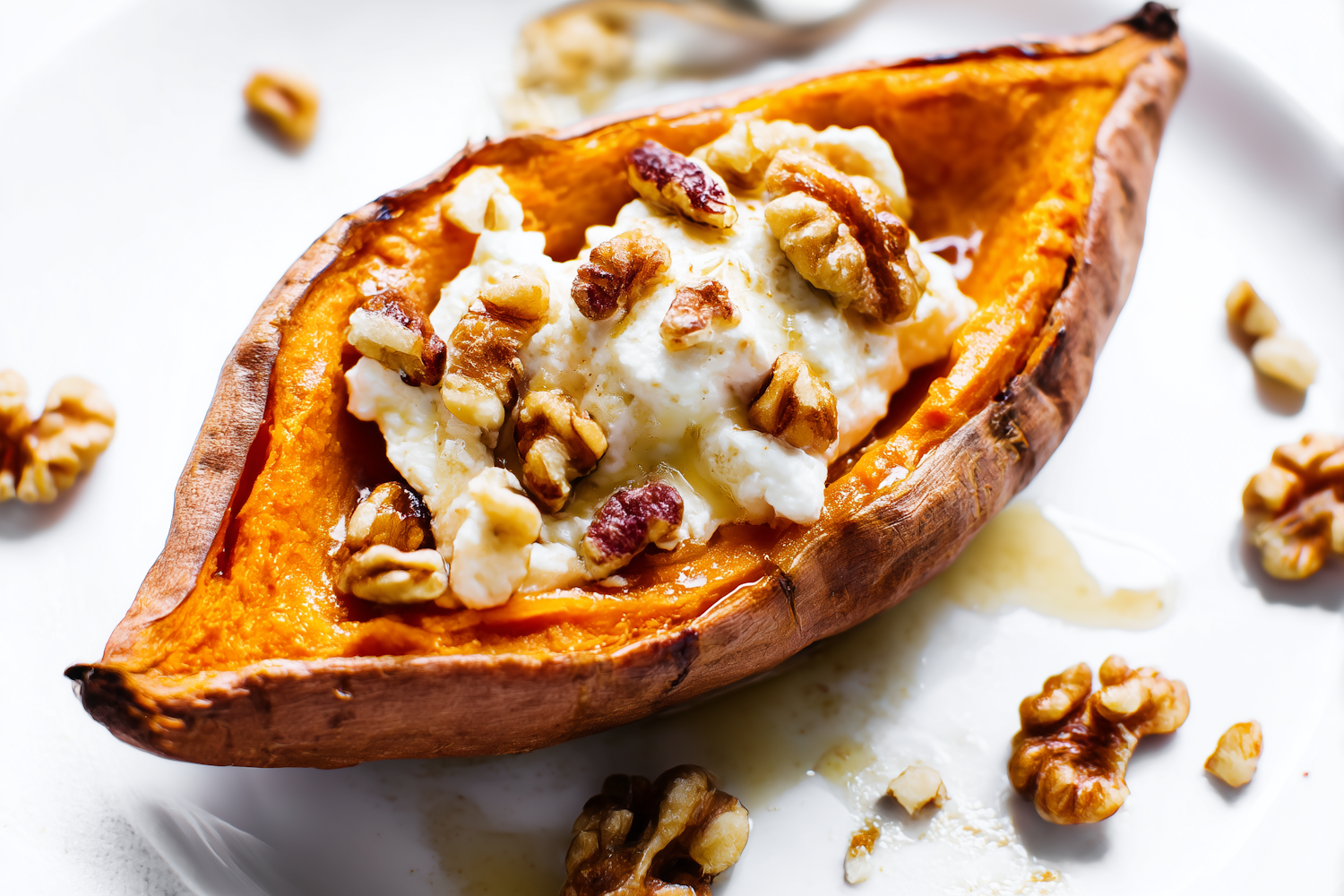 Roasted sweet potato topped with creamy ricotta, crunchy walnuts, and a drizzle of honey on a white plate. Perfect for a sweet-savory treat.