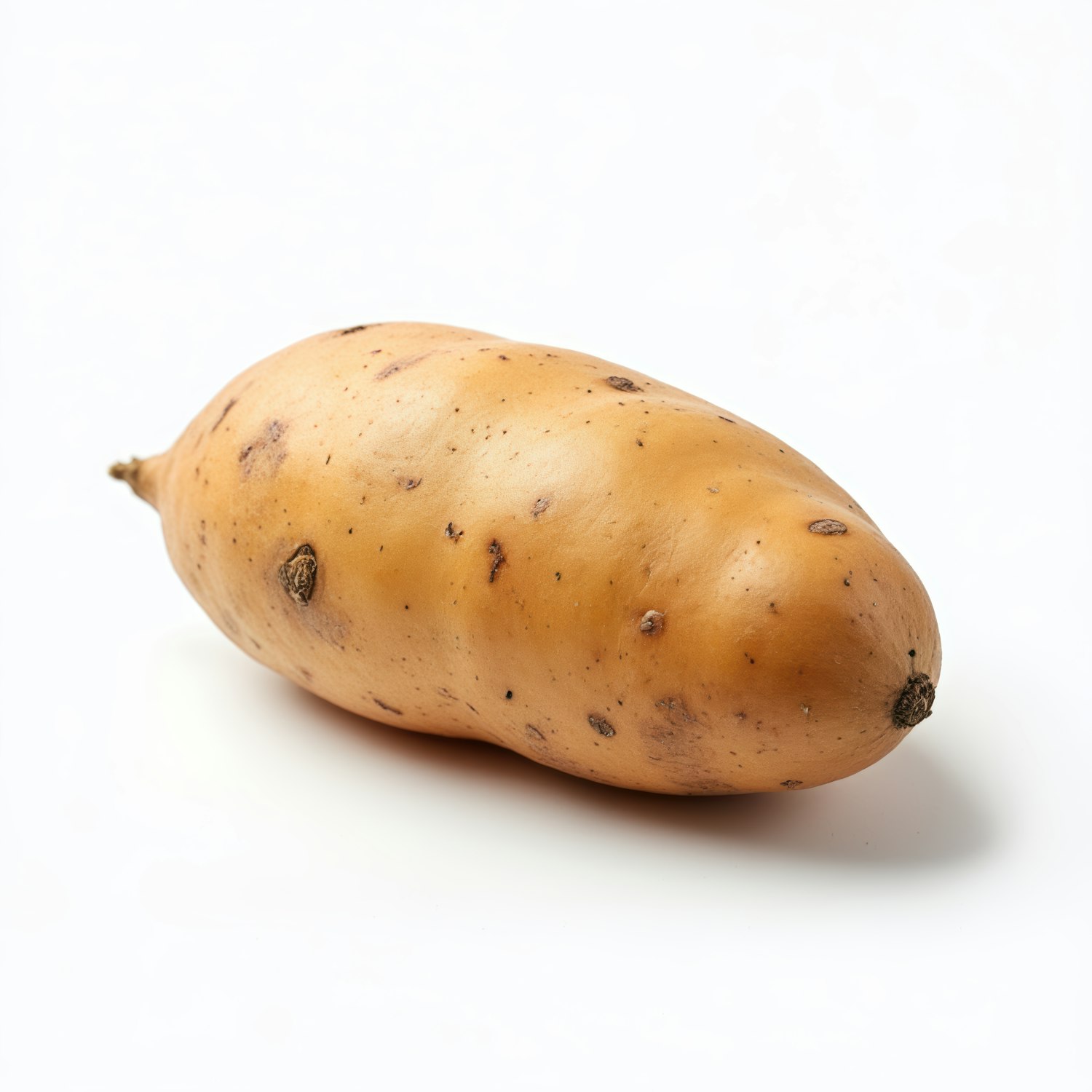 Close-up of a fresh, smooth-skinned potato on a white background, showcasing its natural texture and color.