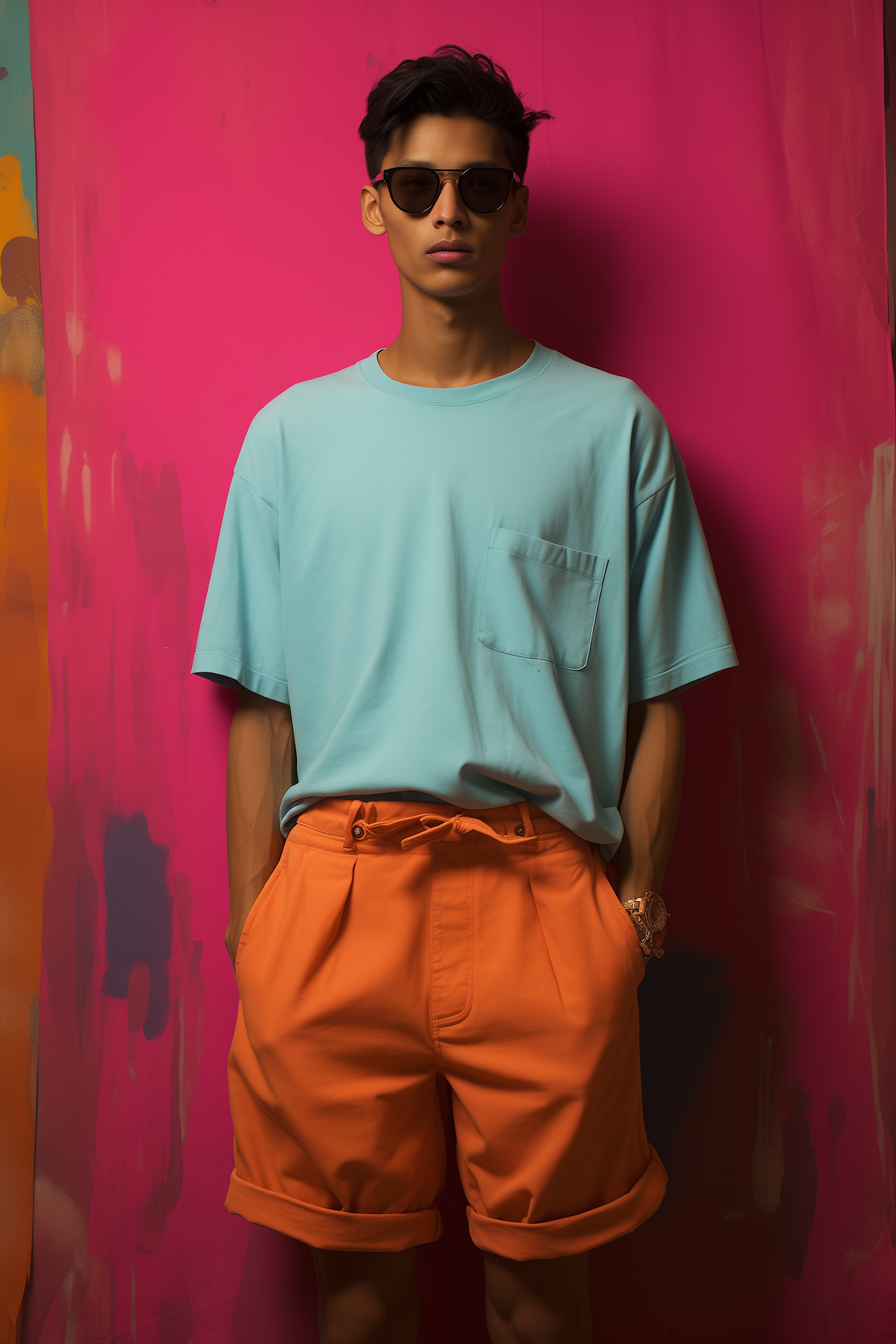 Stylish young man in sunglasses, light blue t-shirt, and orange shorts against a vibrant pink background.