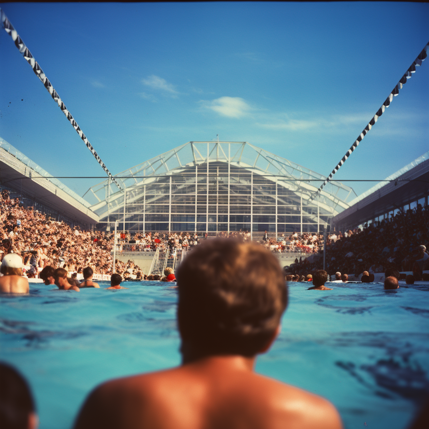 Crowded swimming pool event with cheering spectators, modern glass architecture, and festive flags under a clear blue sky.