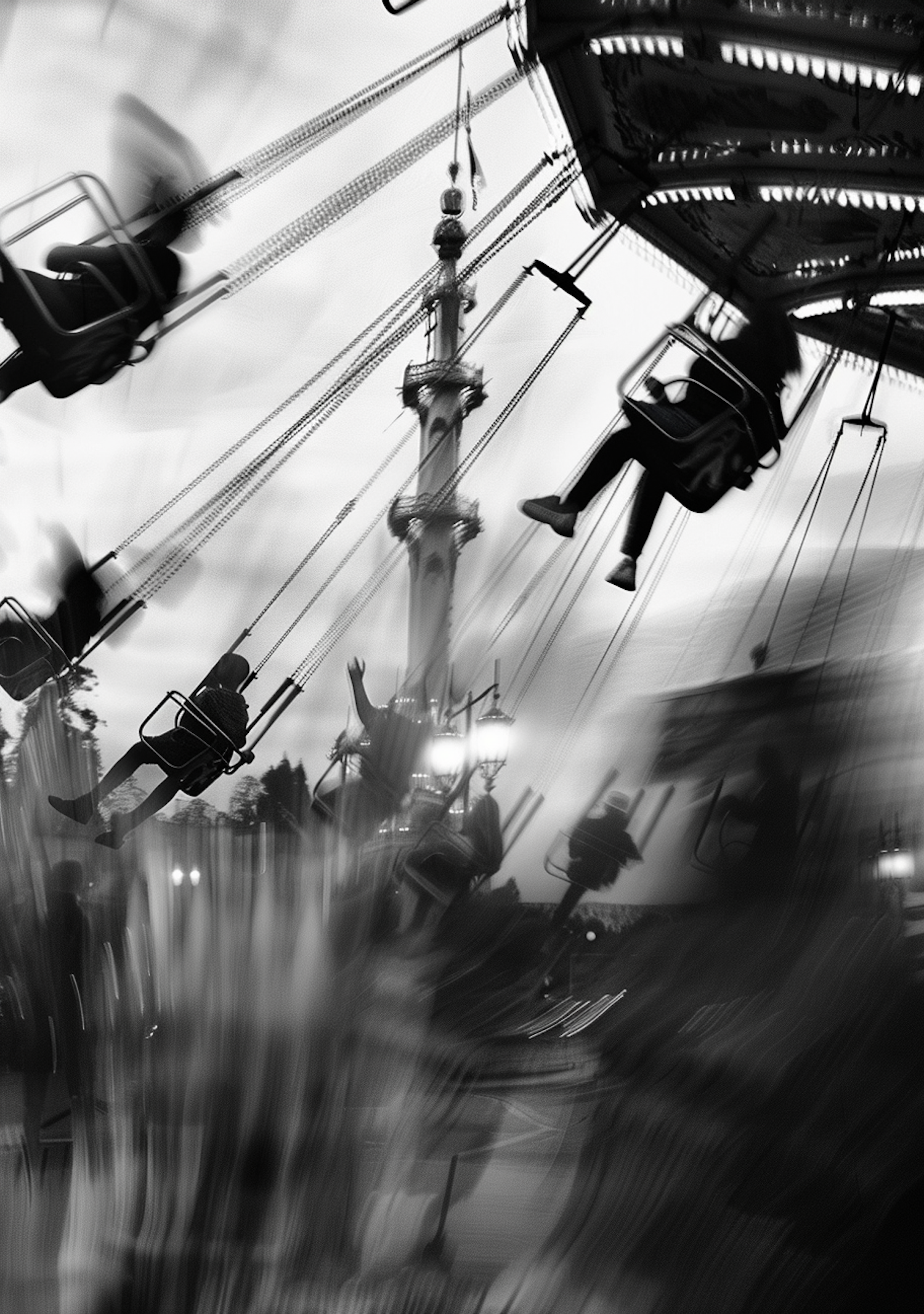 Dynamic black and white image of a swing ride in motion at an amusement park, with blurred figures and an ornate tower in the background.