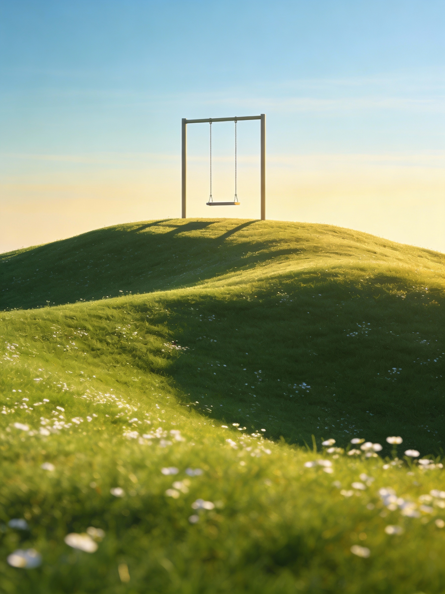 A minimalist park swing frame with a single empty swing standing alone on top of a gentle green hill, viewed from a distance. The hill is covered with soft, realistic grass and tiny white flowers scattered across its surface. The lighting is natural and warm with a clear sky and subtle atmospheric depth. The composition is serene and balanced, emphasizing simplicity and scale. Ultra detailed, cinematic lighting, 8k, realistic texture, minimal design aesthetic.