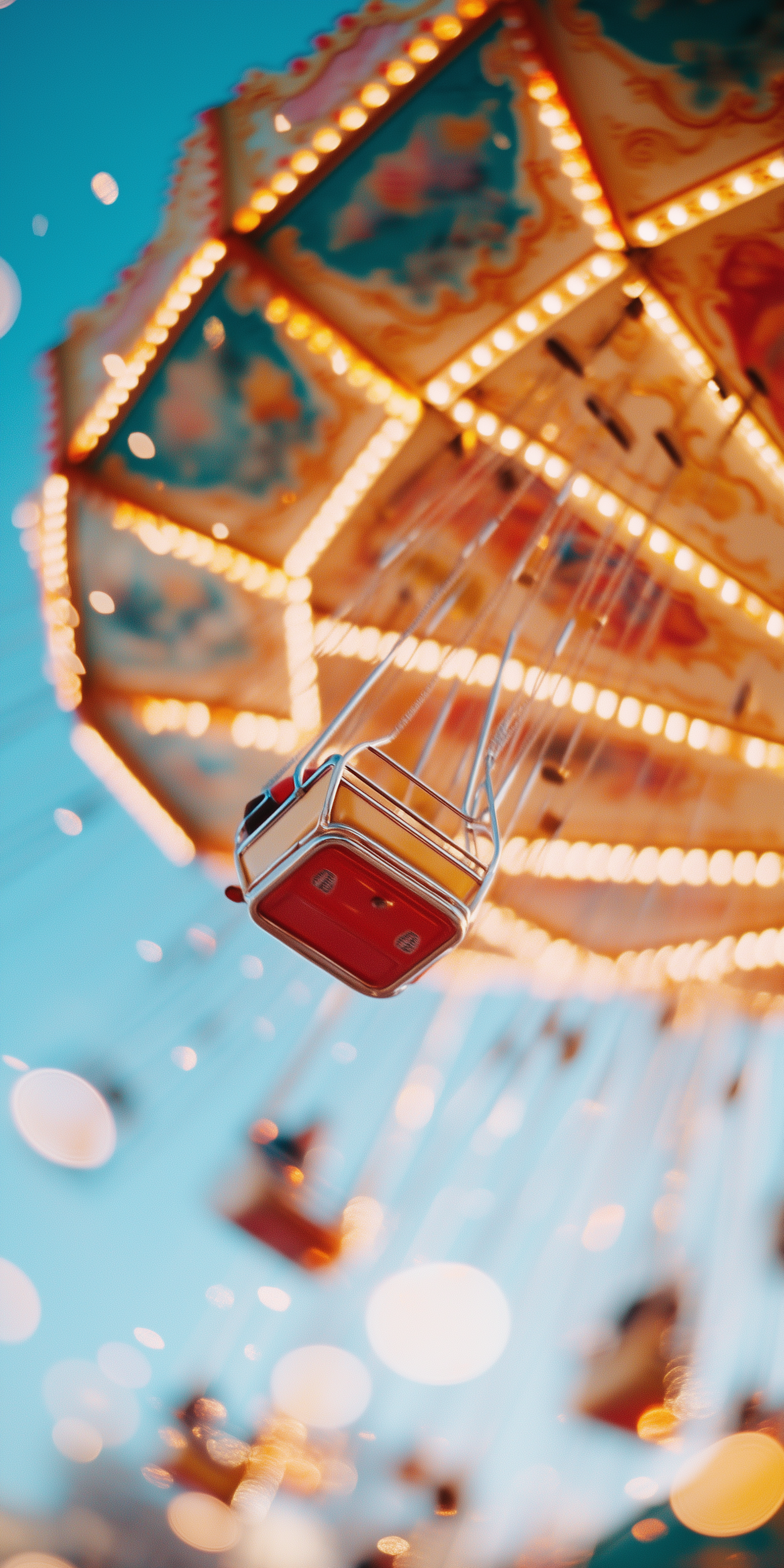 Dynamic image of a swing ride at an amusement park, featuring a colorful canopy and a single red swing seat in motion.