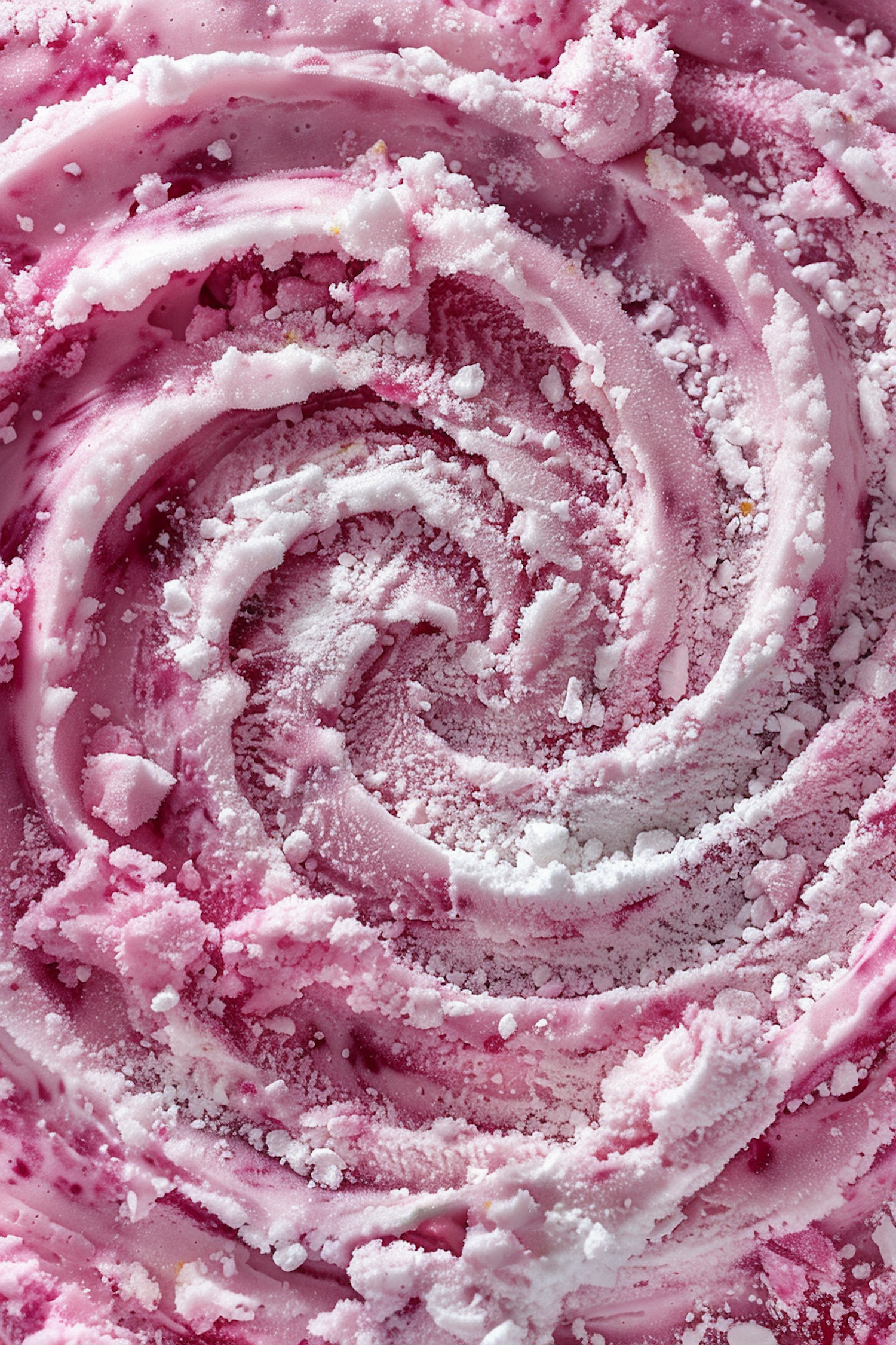 Close-up of pink and white swirled ice cream with frosty texture and vibrant colors, creating a visually appealing pattern.
