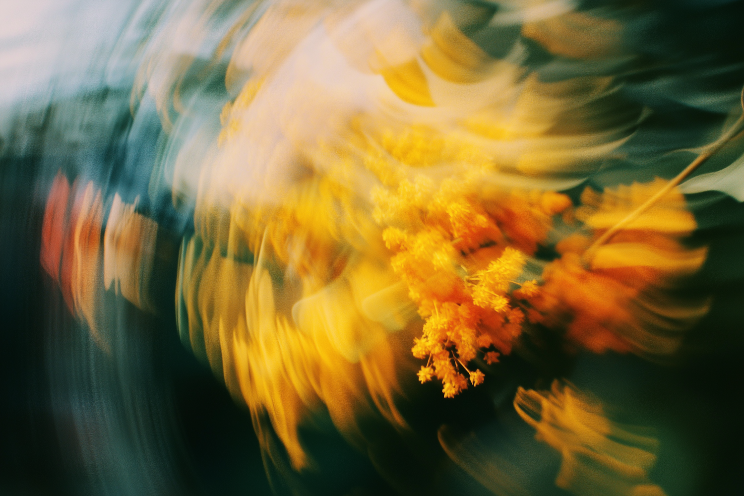 Abstract swirl of yellow mimosa flowers with motion blur, creating a dynamic and dreamy effect against a green and blue background.