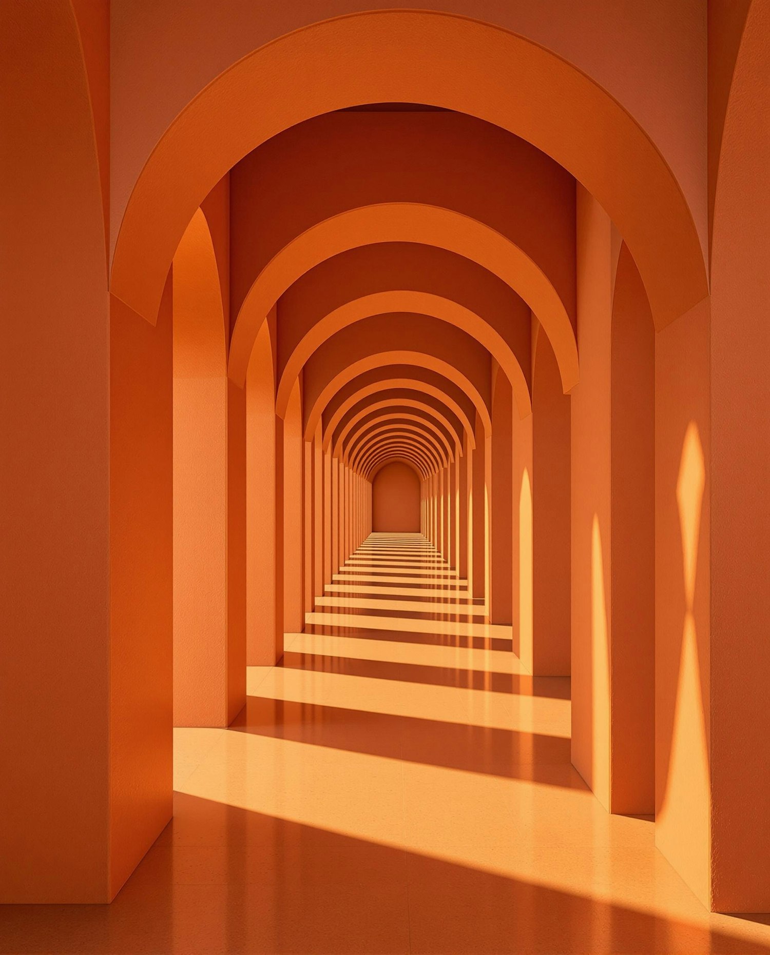 A symmetrical corridor of orange arches with soft sunlit shadows, creating a mesmerizing geometric design.