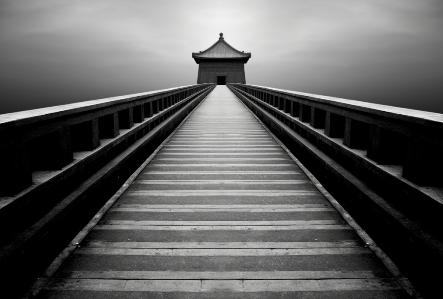 Monochrome image of a wooden bridge leading to an Asian-style pavilion under an overcast sky, creating a serene and symmetrical scene.