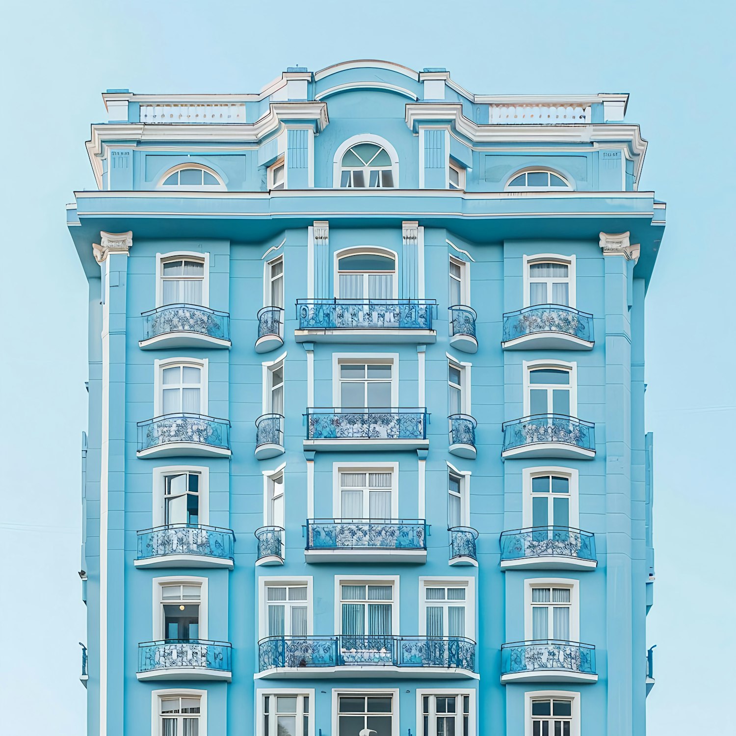 Elegant blue building with intricate balconies and classic architecture against a clear sky.