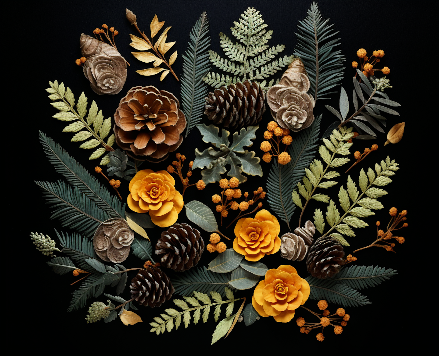 Elegant floral arrangement with yellow roses, pinecones, and ferns on a dark background, creating a harmonious natural display.