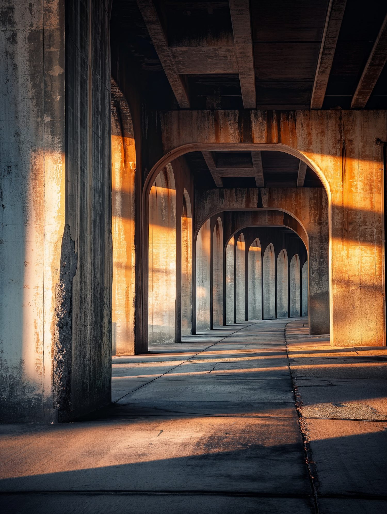 Concrete arches under a bridge bathed in golden sunlight, creating dramatic shadows and a tunnel-like perspective.